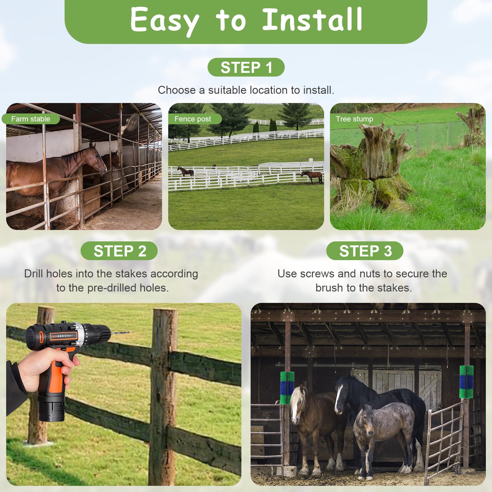 Easy to install/disassemble, This goat brushes for grooming includes 1 brush and 4 screws. It can be installed in barns, pastures, livestock fences, horse sheds, trees, walls, or anywhere outdoors, and it is also easy to dismantle if you need to demolish it.