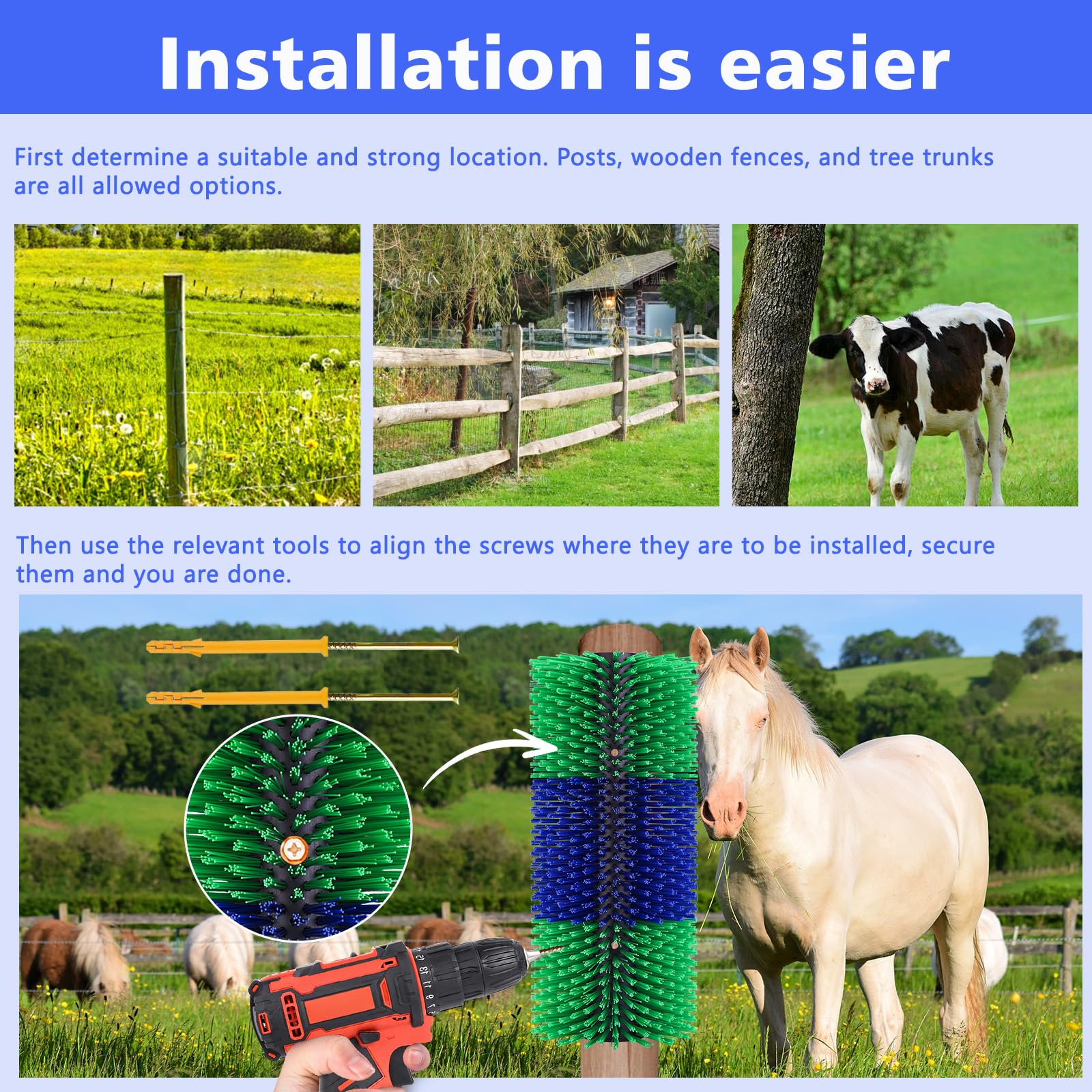 Easy Installation: No need to worry about the tools for setup, it can be easily installed in your corral, Iron Column, or outdoors, and is very strong (also for walls).Our back scratcher brush comes with an ample number of screws and nuts.These livestock scratch brushes can be willingly installed in various places at the barn, outdoors, on posts, poles, or walls. With both ease and security in mind, you can set up these cow scratcher brush with minimum labor