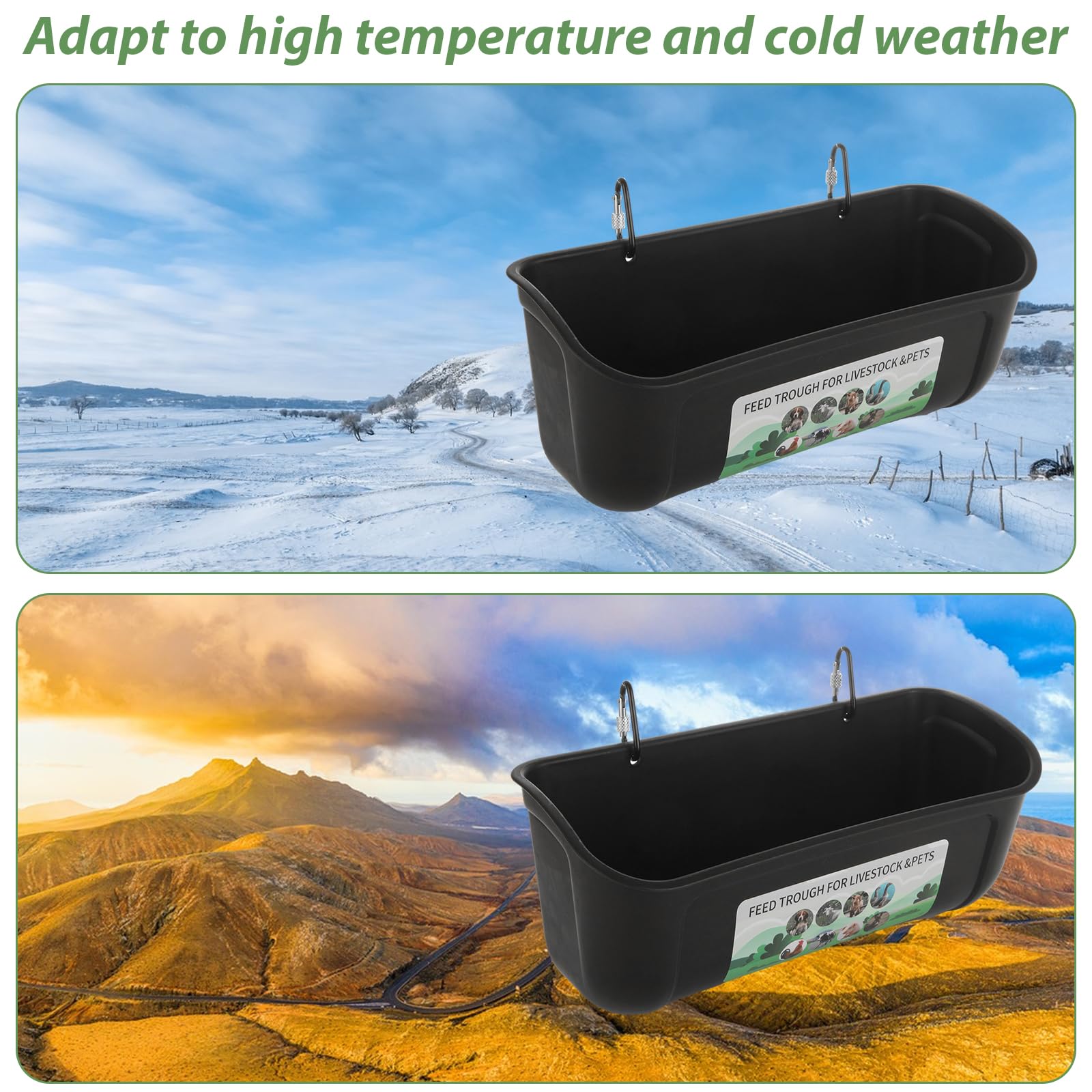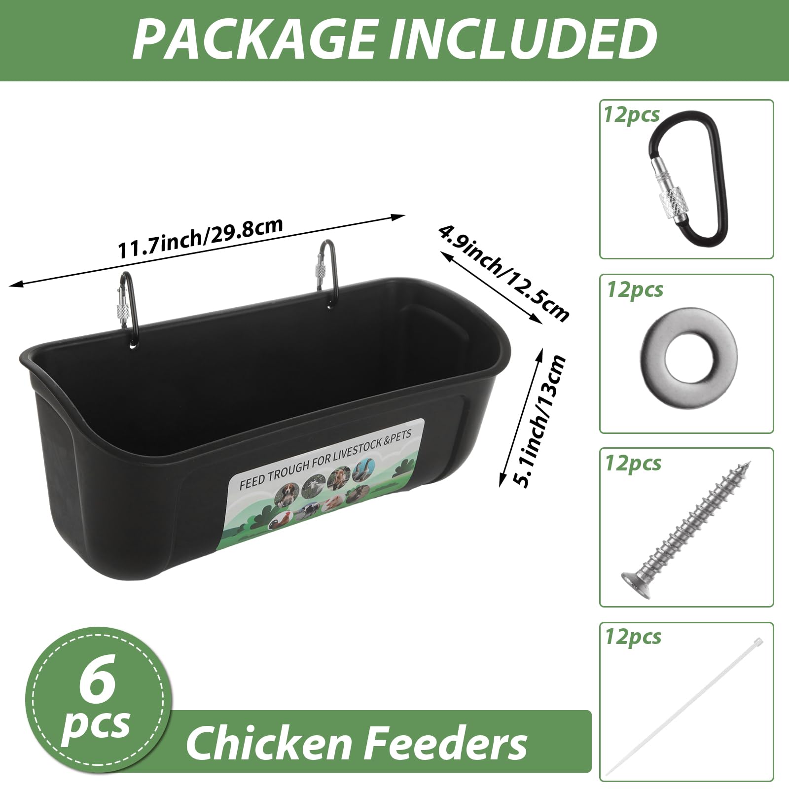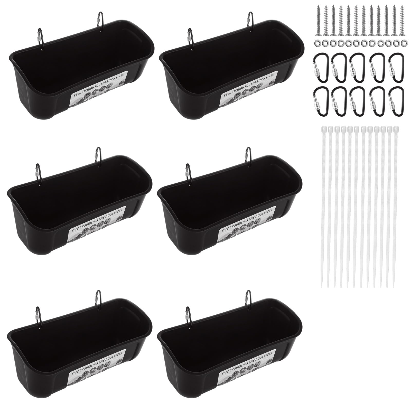 Package Included: You will receive 6 PCS black goat feeders hanging, 12 PCS carabiners, 12 plastic nylon ties, and 12 PCS screws kits. The hanging pig feeder measures 11.7x4.9x5.1 inch/29.8x12.5x13 cm, the large capacity can hold up to 5 quarts of feed and water