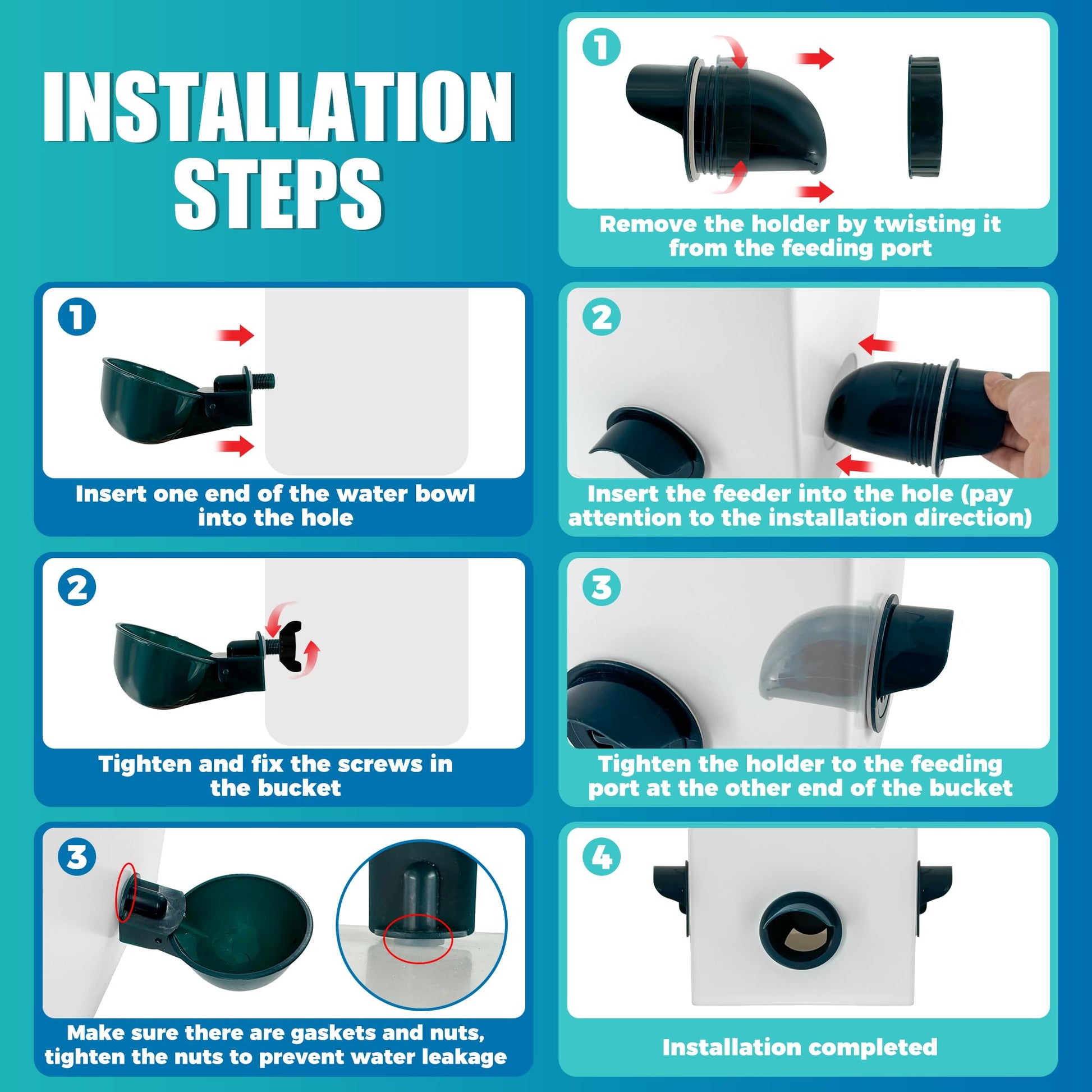 Convenient and Efficient Poultry Feeding and Watering Kit: Loyala Chicken Feeder and Drinker Set includes a 25-pound feeding bucket and a 3-gallon drinking bucket, with 3 feeding ports and 4 drinking ports respectively. For those who have little time and busy schedules, automatic chicken feeders are undoubtedly the most efficient and economical way.