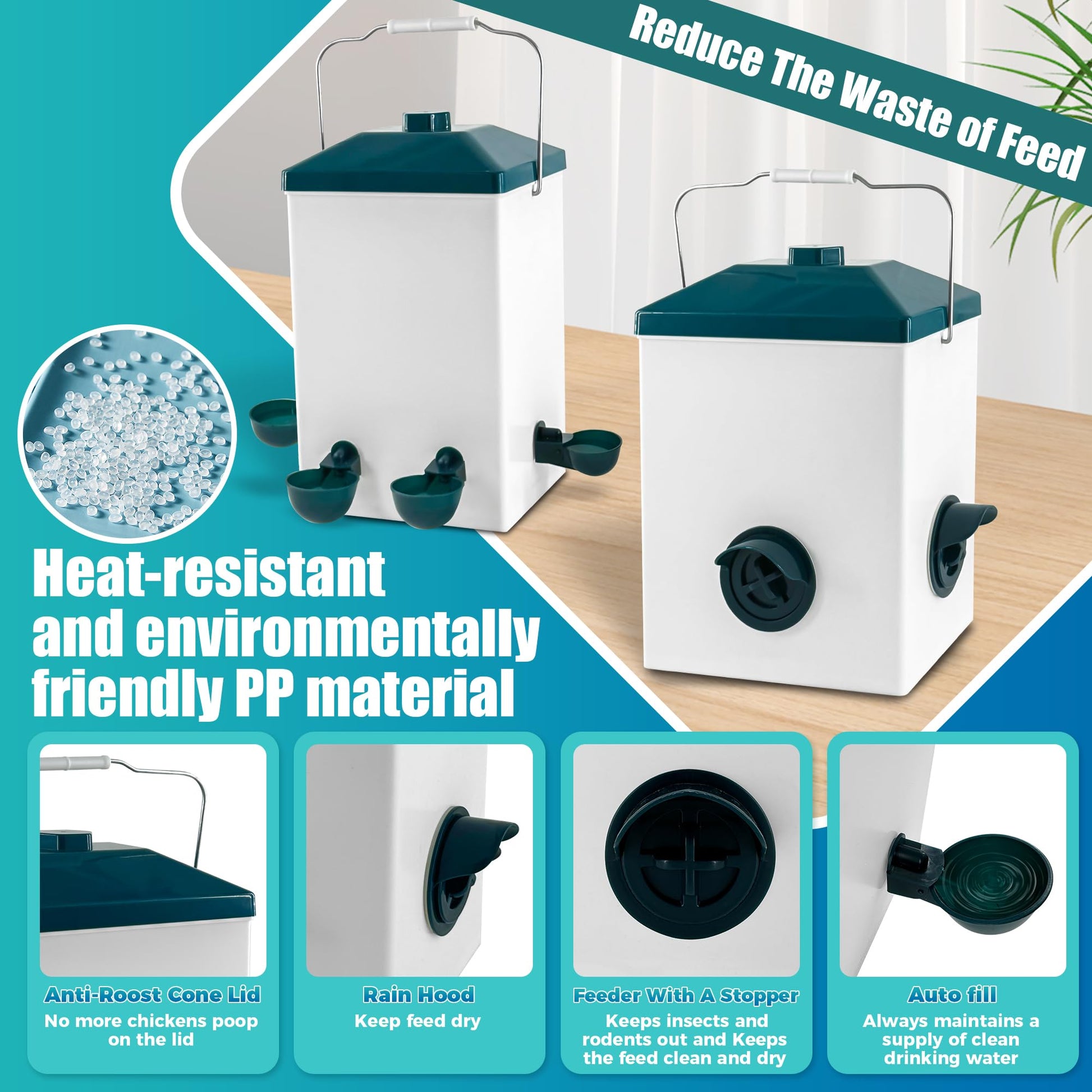 Healthy and durable material: The chicken feeder and waterer are made of PP material, which is heat-resistant and environmentally friendly. The newly upgraded anti-roosting cone cover can effectively prevent chickens from roosting and defecating on the bucket, keeping the inside and outside of the bucket clean.