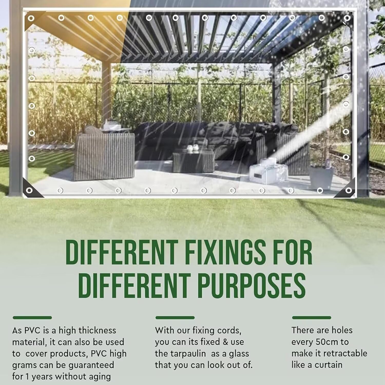 【Clear Tarp Materials 】14 Mil Waterproof tarp is made of PVC vinyl, Edge Stitches Made of Polyester Fiber, Corners with Rubber Triangular Sleeves, Reinforced Edges, Strong and Durable, and Can Quickly and Easily Fix the Tarpaulin. Heavy Duty tarp can withstand the strong wind without tearing.