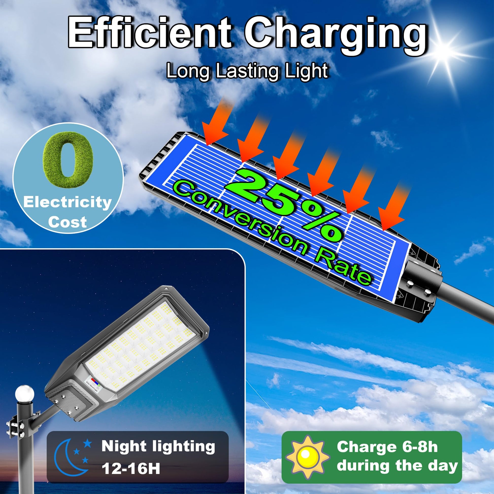 0 Electricity Costs&Ultra-Bright 9000W Solar Lights And Wid Lighting Rance: The 9000W Solar Street Light is your cost-effective and eco-friendly lighting solution, now with an astounding 300000 lumens of brilliant illumination.Powered entirely by solar energy, it eliminates the need for electricity.4100 Sq. ft. wide range lighting rance.