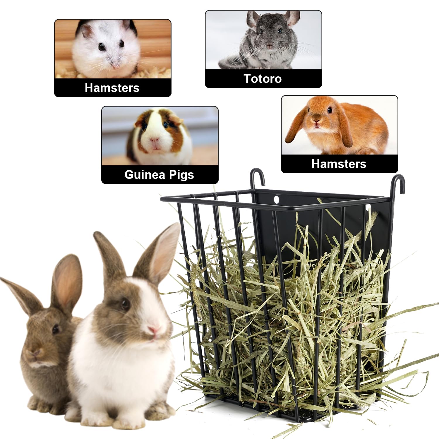 Easy to Install and Clean: Bunny hay feeders with hook design, simply attach it to the cage bars, Plus, the clever addition of Adjustable hook in the design, so you won't have to worry about your pets knocking it over.and its easy-to-clean design ensures effortless maintenance.