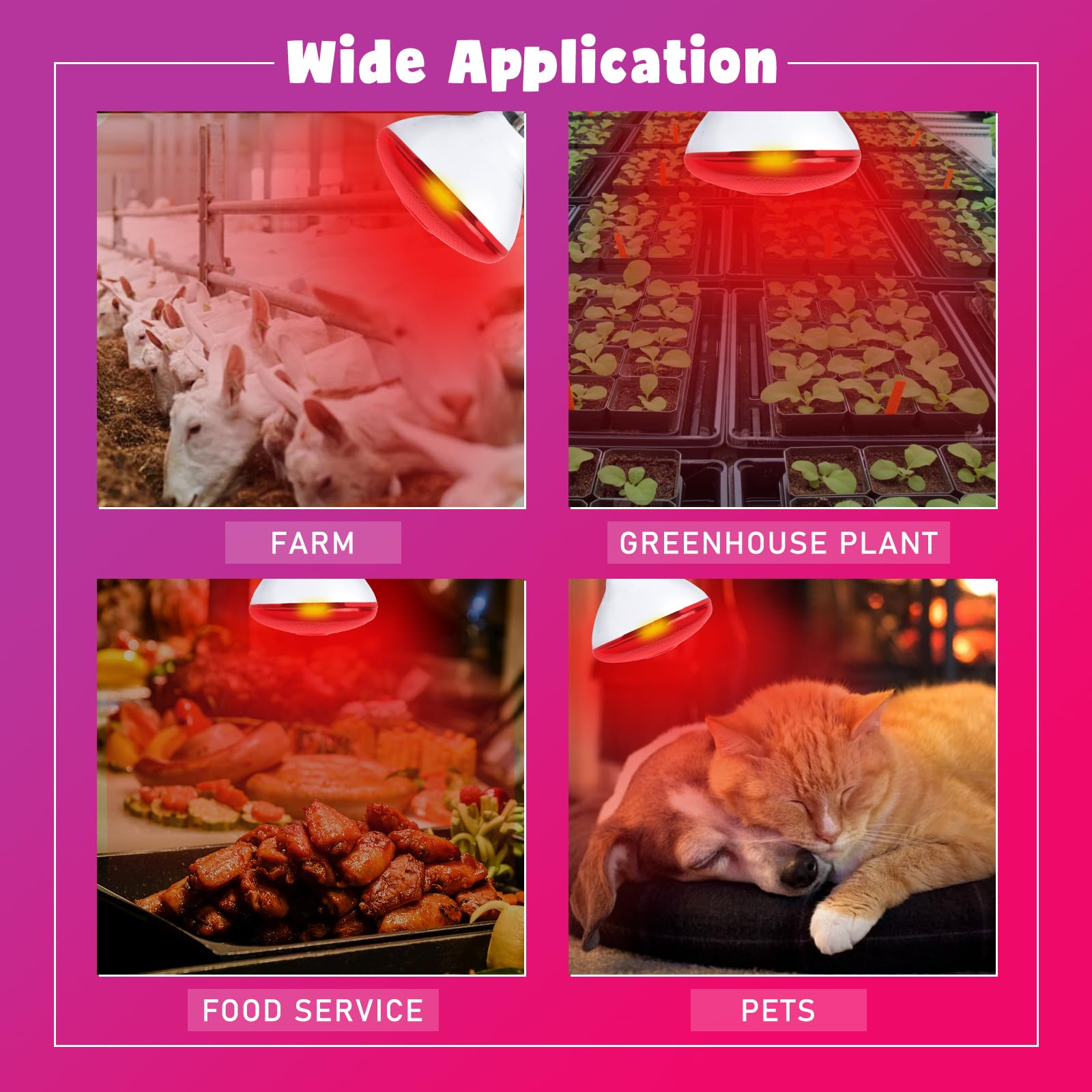 Wide Use: Our infrared heat lamp is widely used, not only for chicks coop and poultry, but also for reptiles such as bearded dragons, lizards, snakes, and pets such as cats and dogs. In addition, this red heat lamp bulb provides heat preservation for food