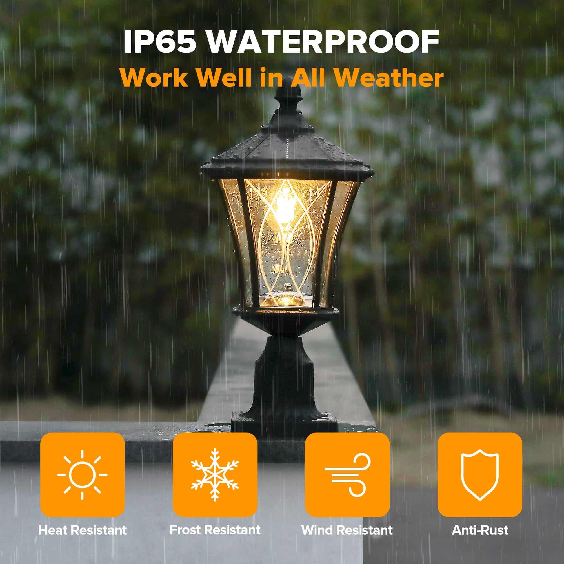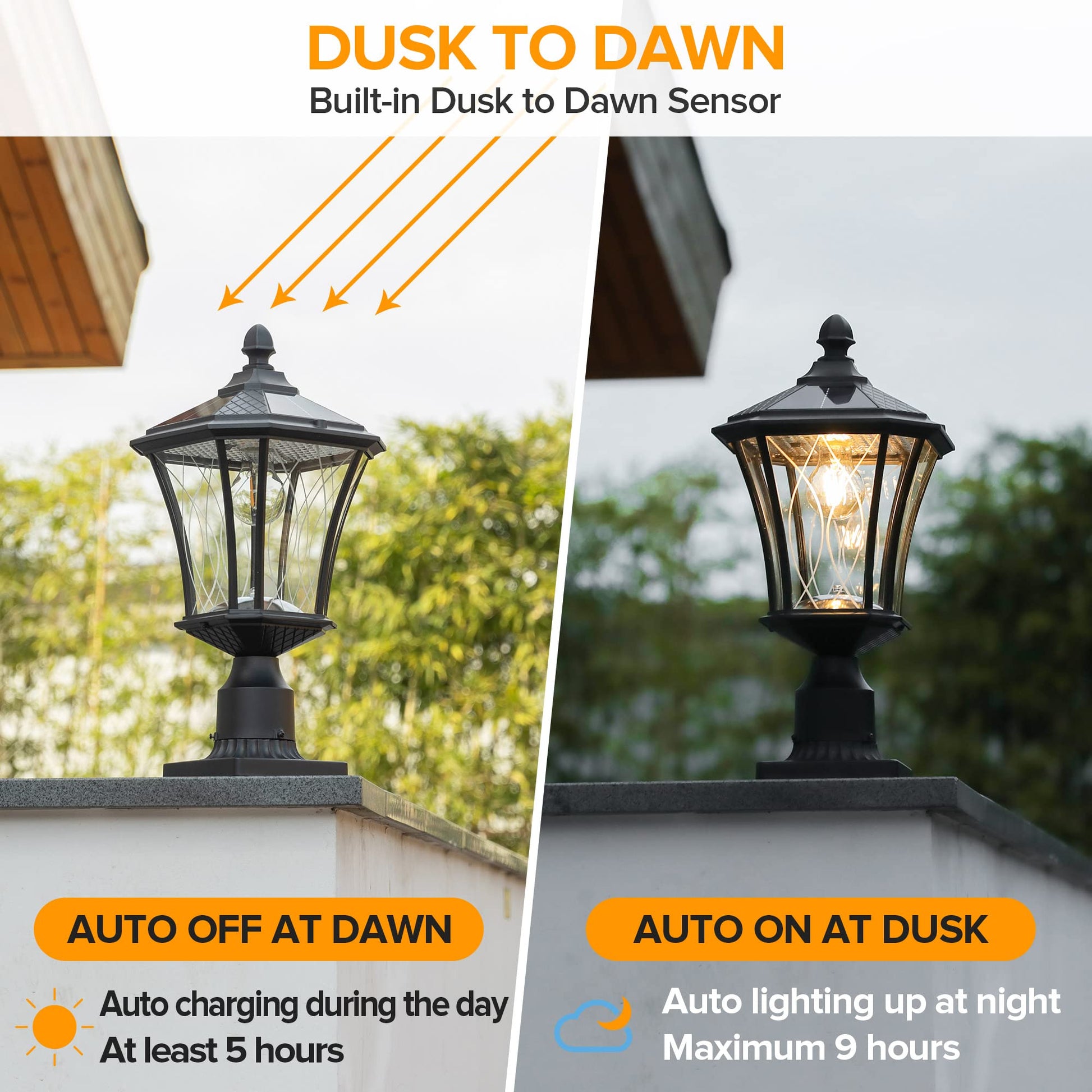 • 【DUSK TO DAWN 】 The outdoor post light is programmed to automatically turns on at dusk and turns off at dawn. Auto charging during the Day, auto lighting up at night.