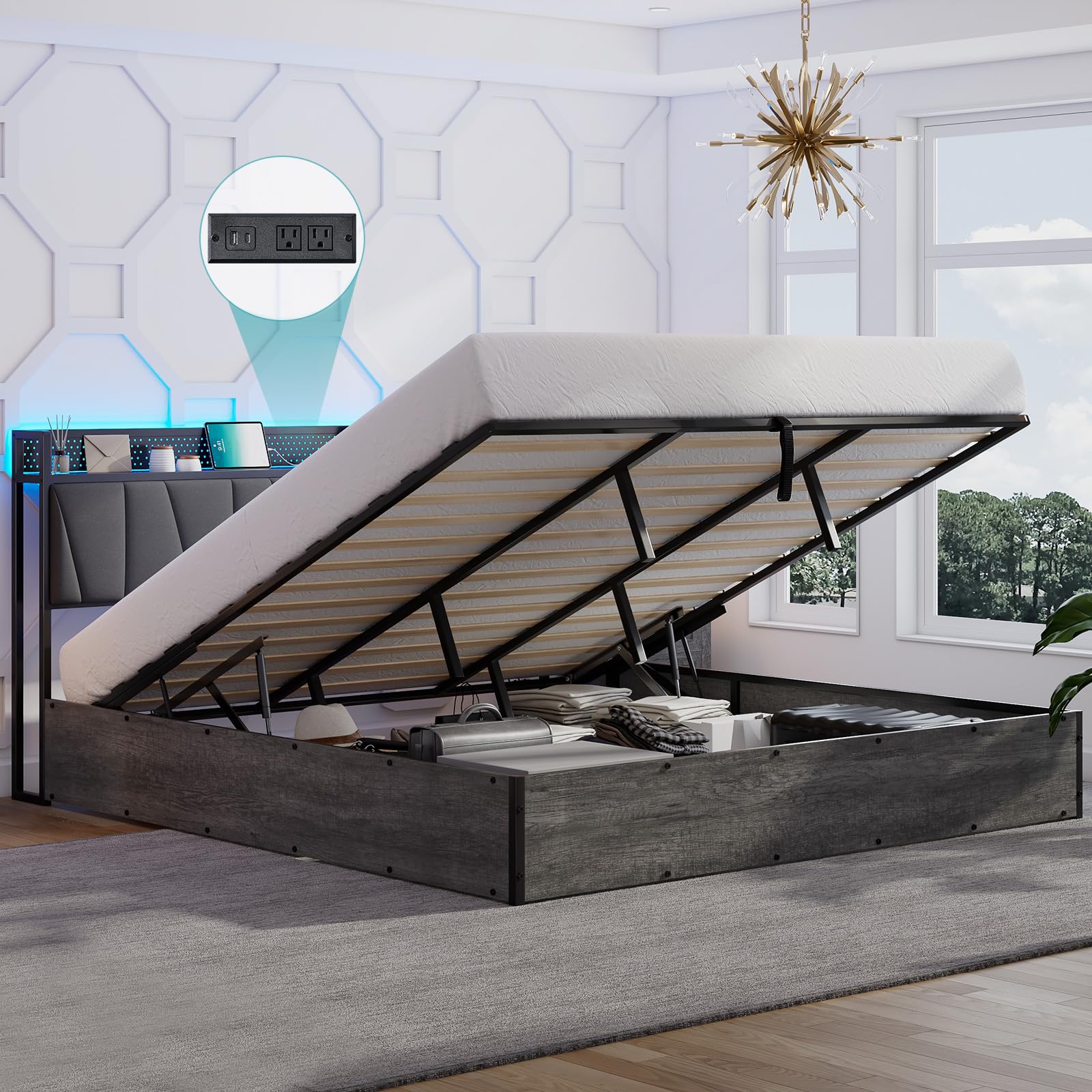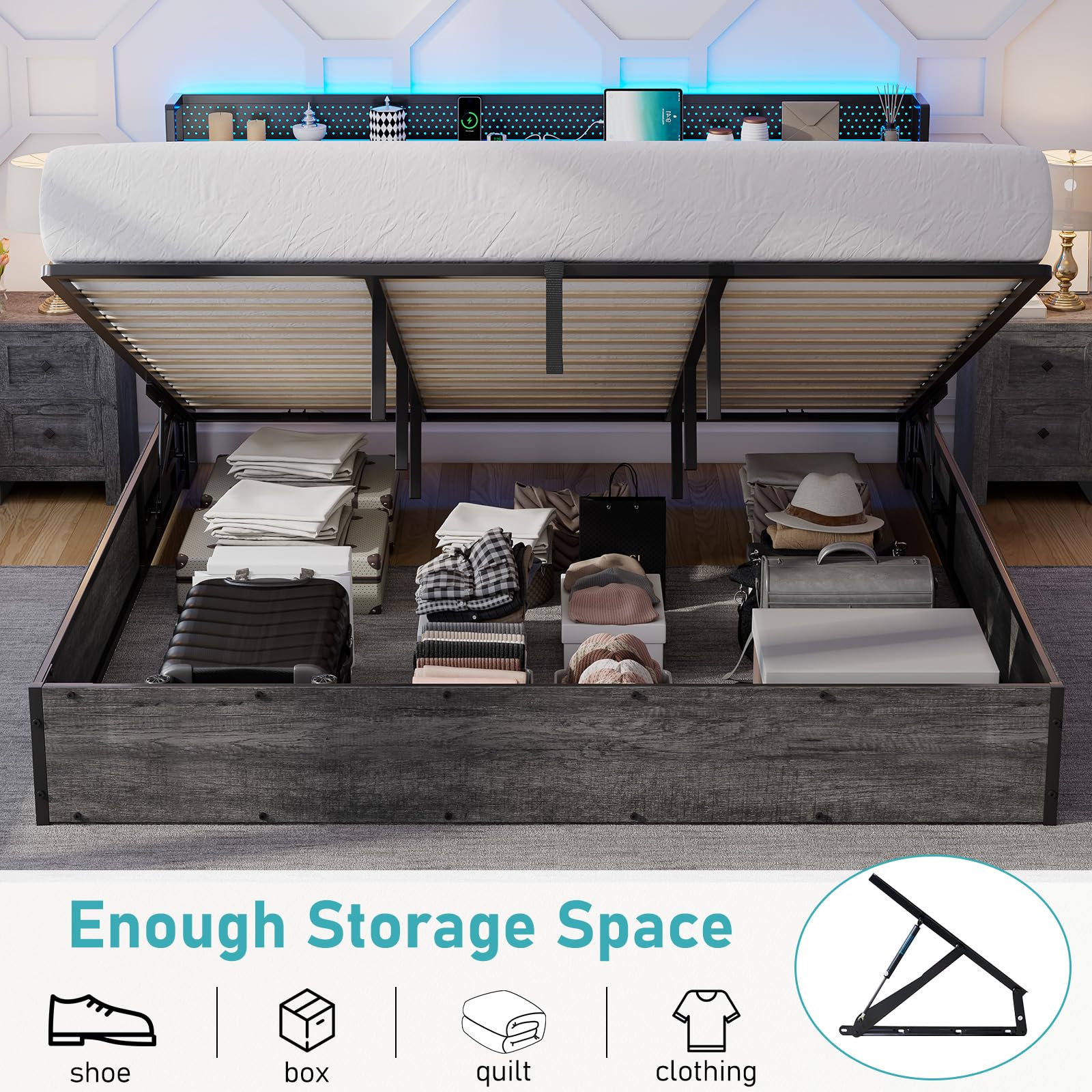 LUXOAK King Size Lift Up Storage Bed Frame with LED Lights, Linen Upholstered Headboard with Charging Station, Wooden LED Light Platform Bed Frame, No Spring Box Needed, Rustic Grey