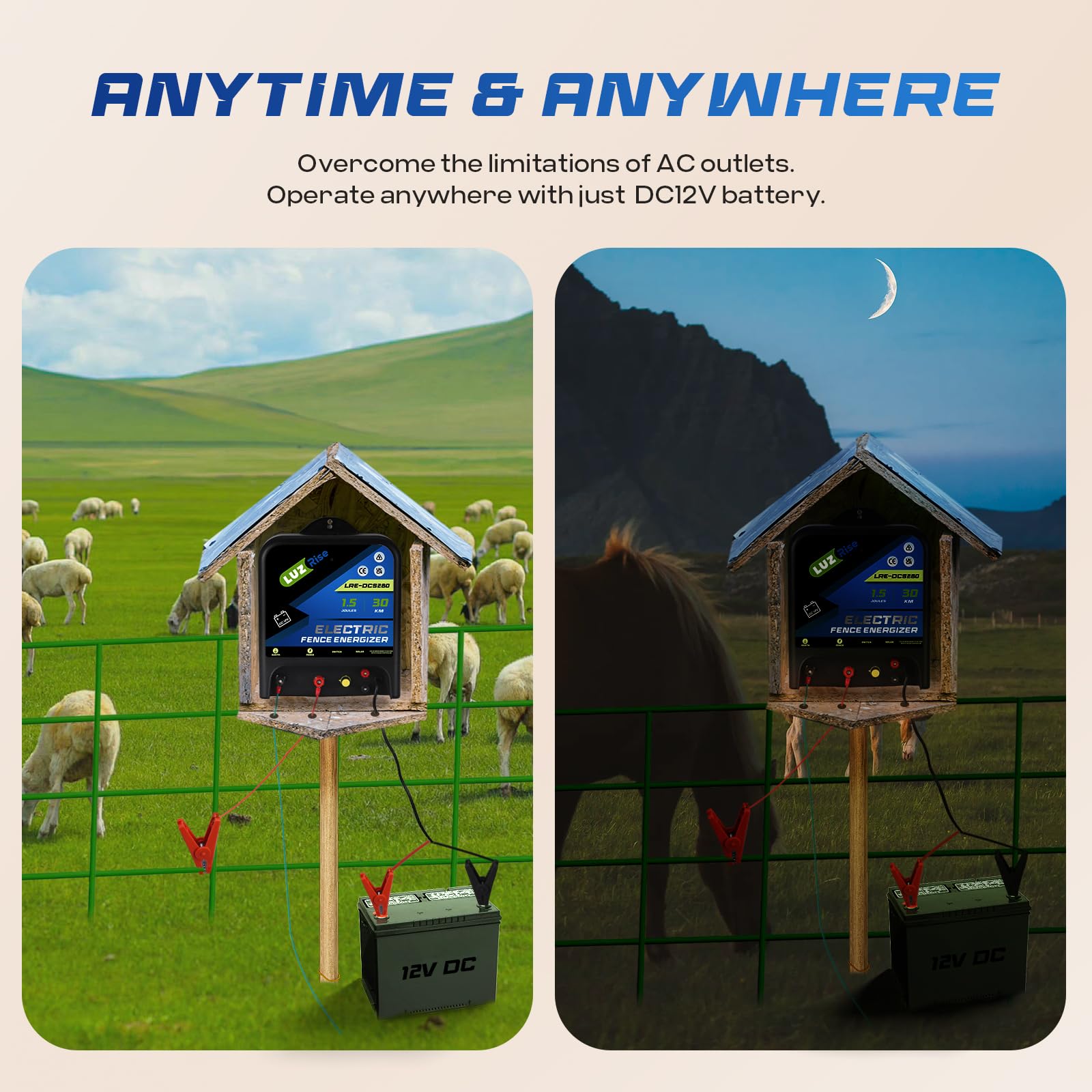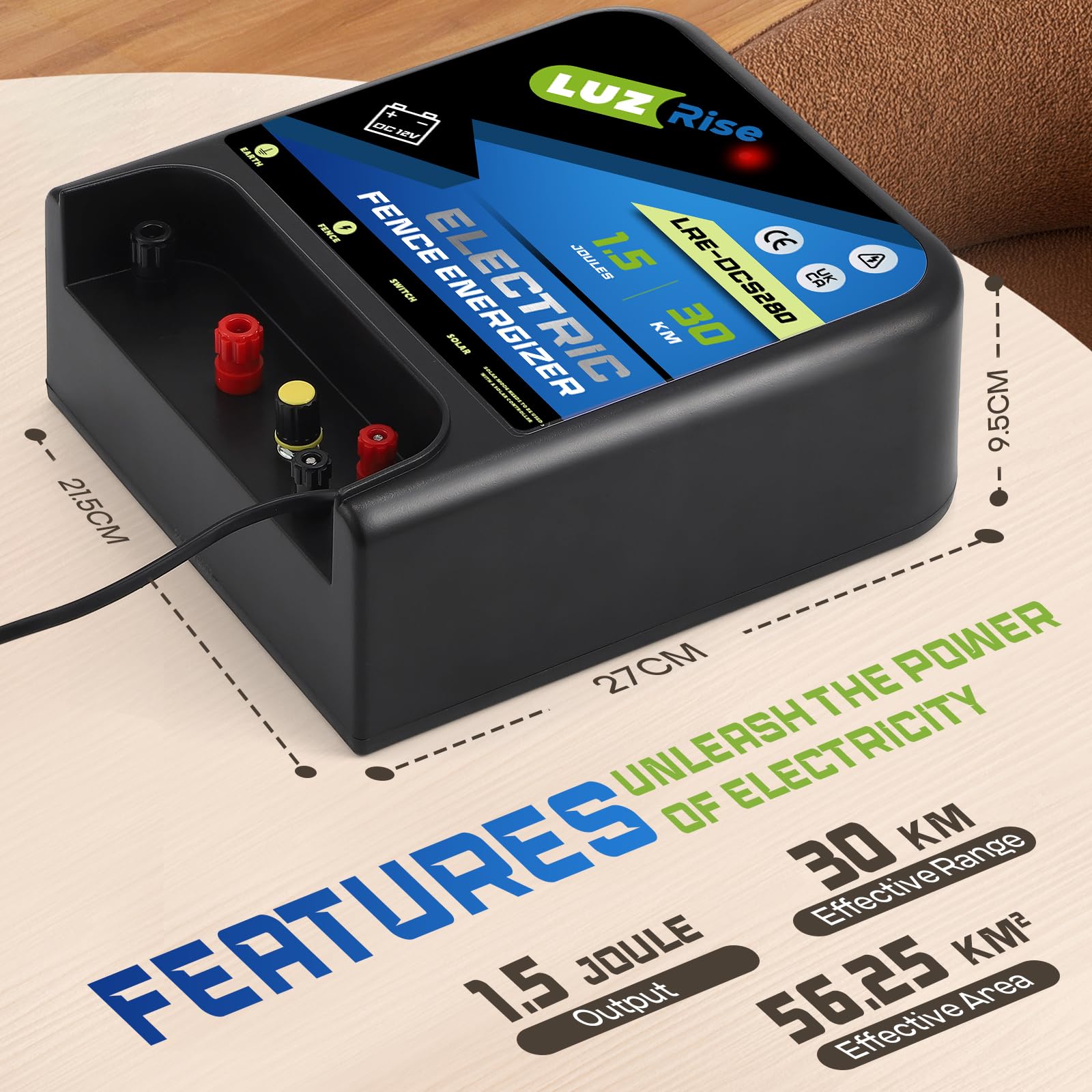 Luzrise 30KM Electric Fence Energizer 2 in 1 Powered by DC Battery or Solar Electric Fence Charger, 1.5 Joules Output with IP65 Waterproof Function for Livestock, Pet, Poultry, Garden (LRE-DCS280)
