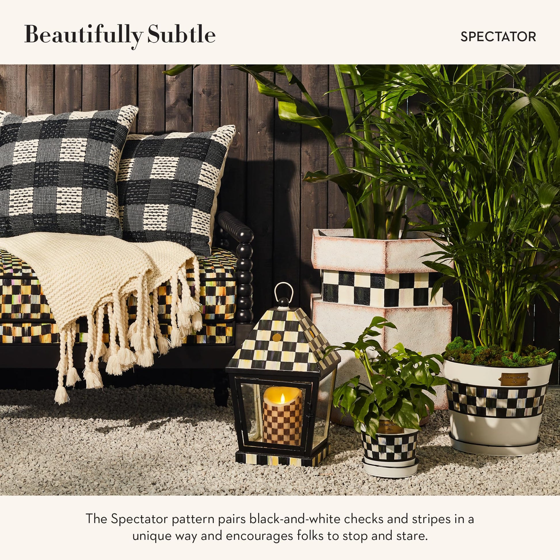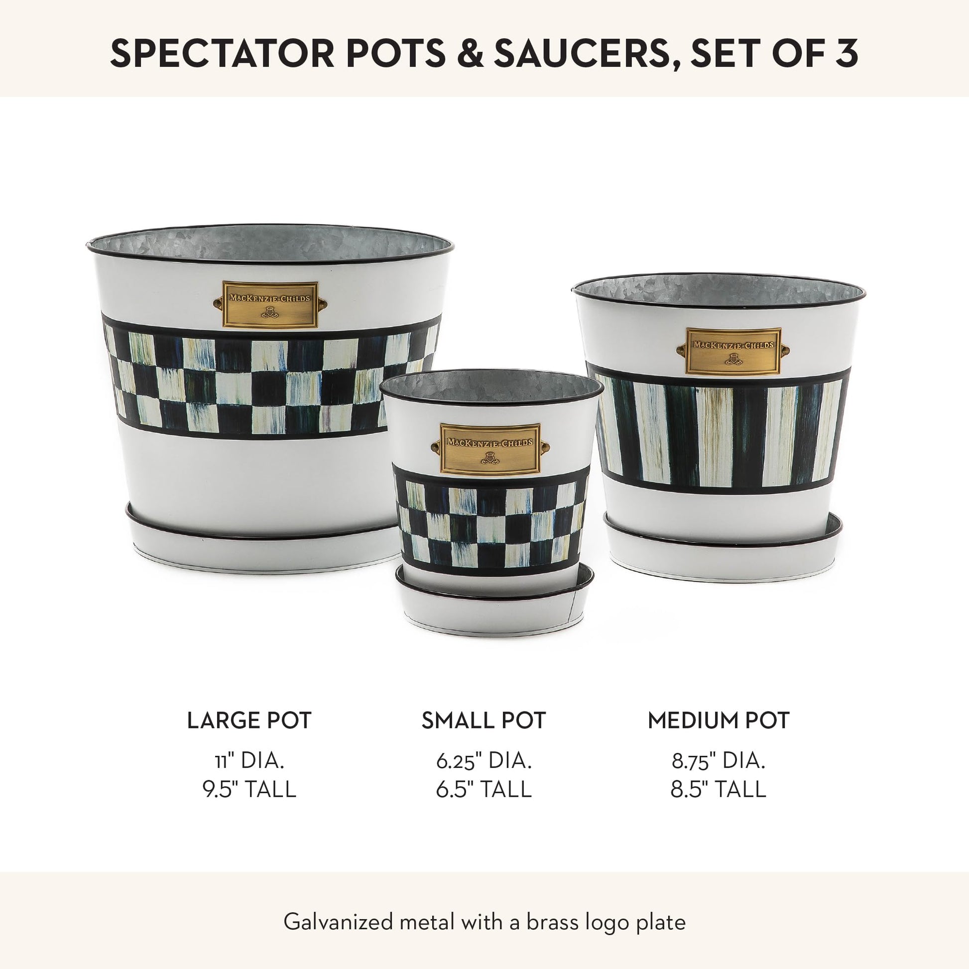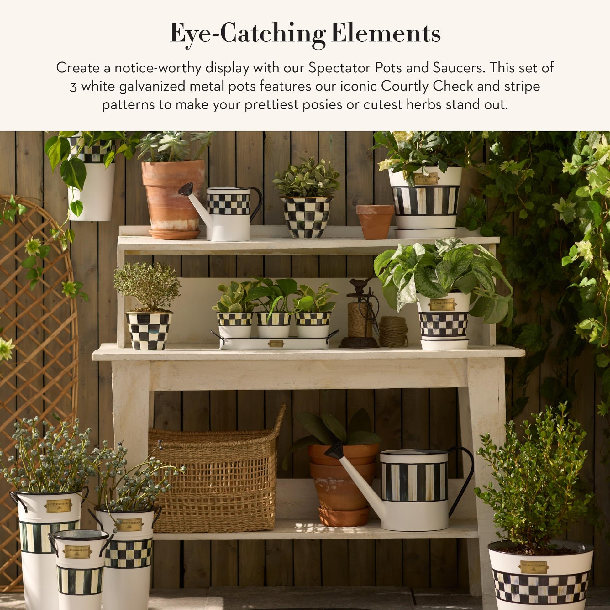ELEGANT OUTDOOR & INDOOR PLANTING ESSENTIALS: Our Spectator galvanized metal pot set features 3 different pot sizes with accompanying saucers. Each pot is decorated with black-and-white Courtly Checks or stripes and finished with a brass nameplate.