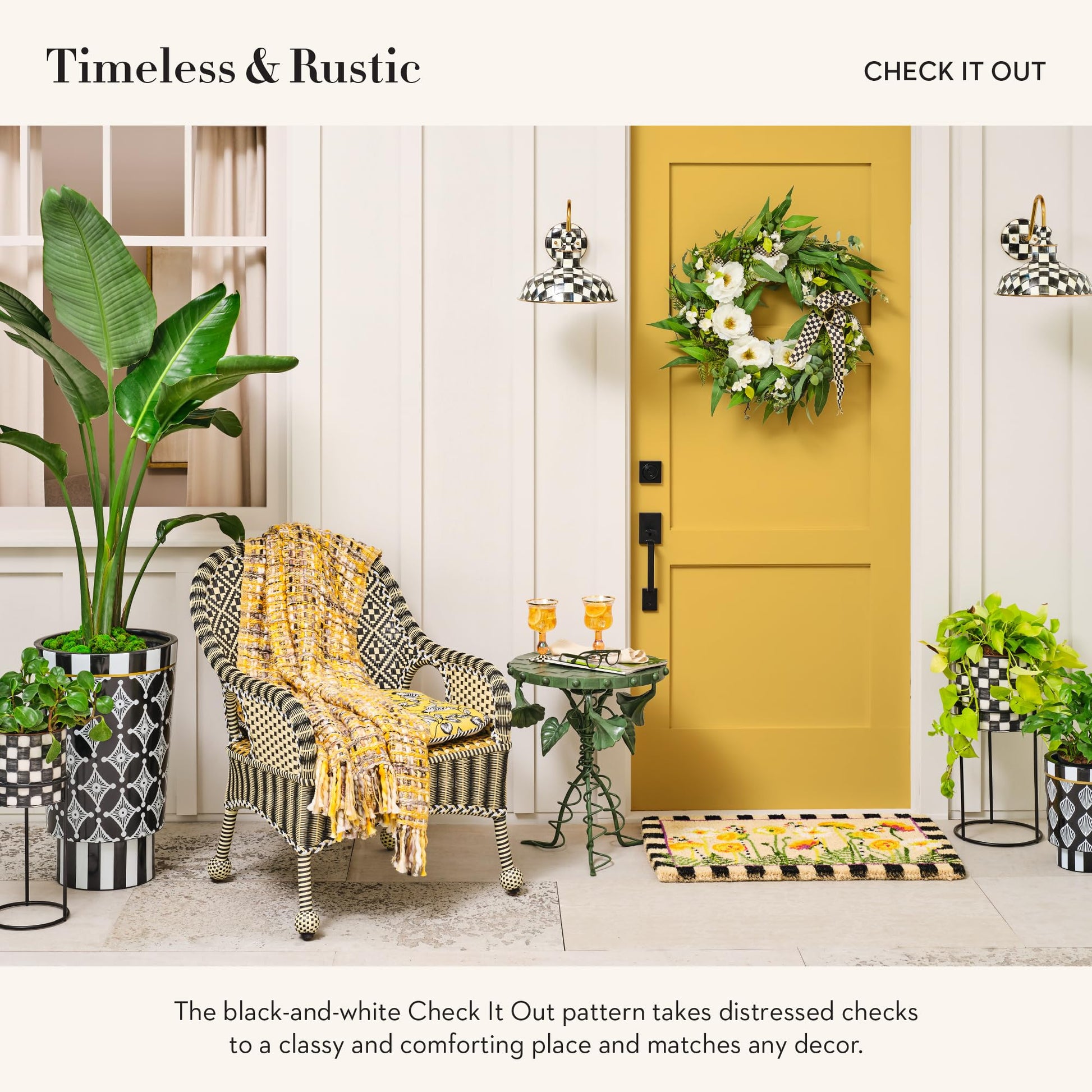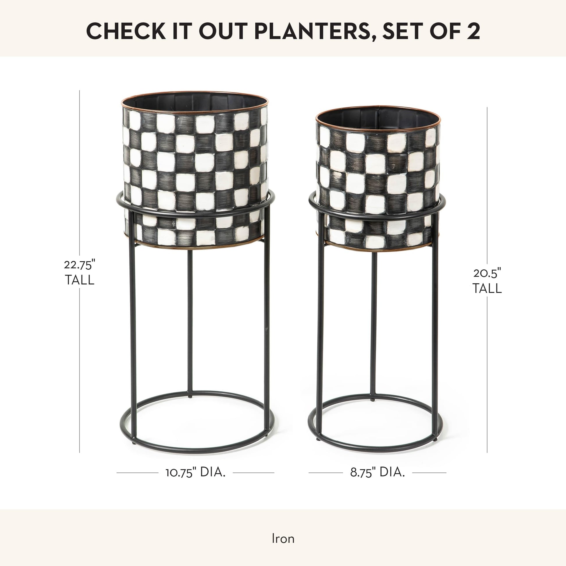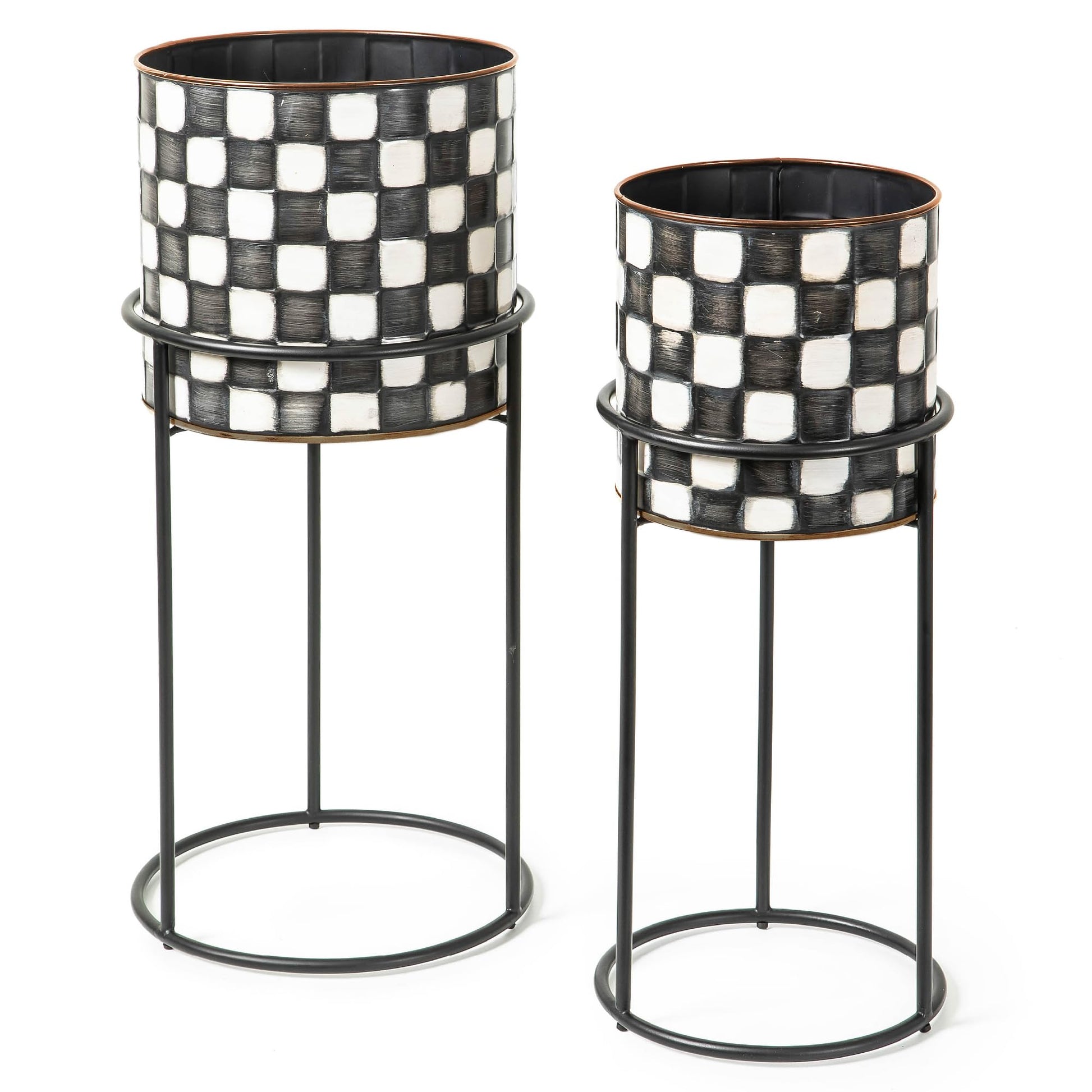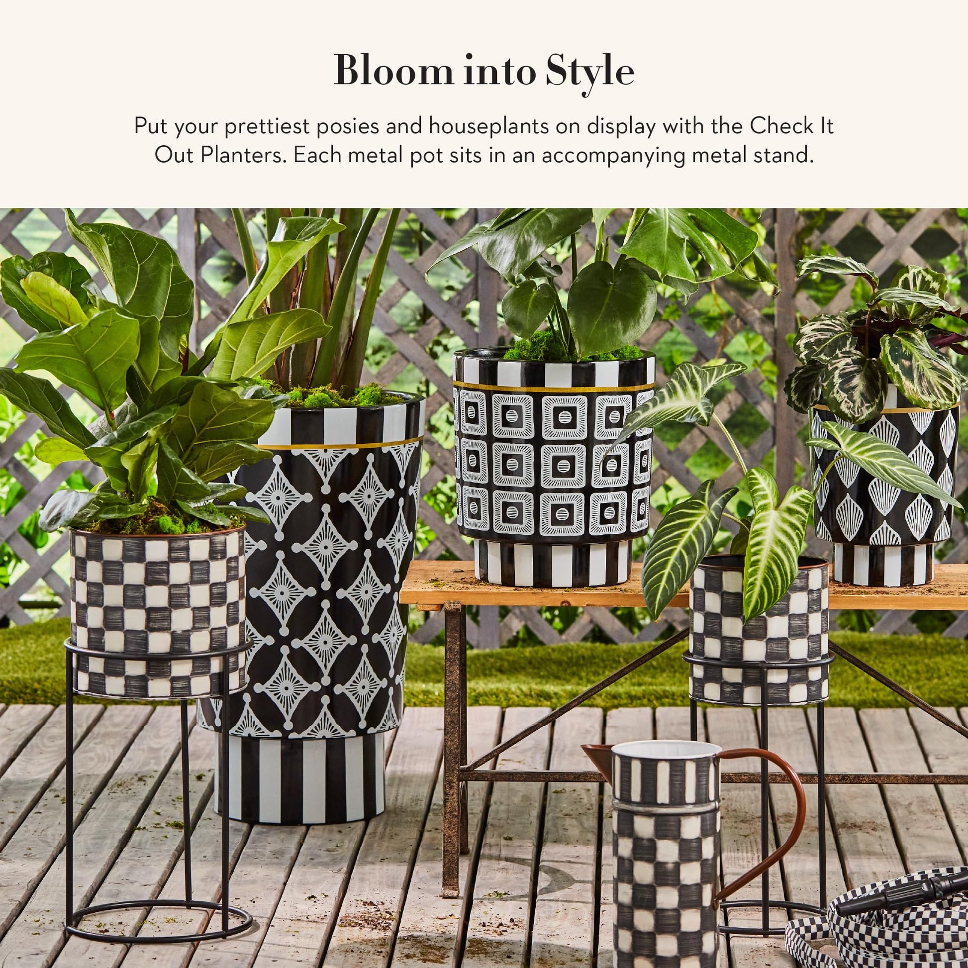 ELEGANT GARDEN ACCENTS: Each metal planter pot is decorated with distressed black-and-white checks and sits in an accompanying black metal stand. These garden planters bring versatile style to any indoor or outdoor spot.