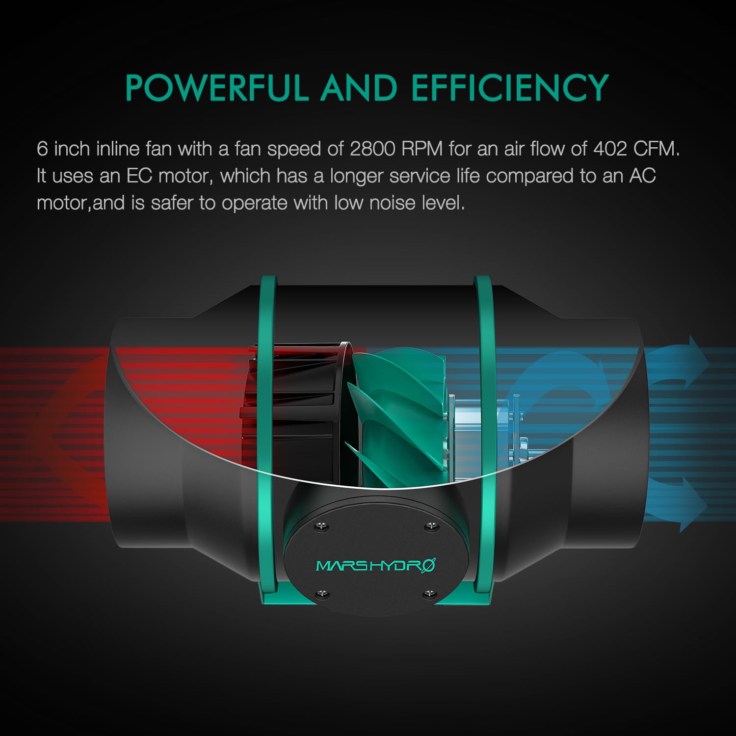 • Powerful Inline Fan: Mars Hydro iFresh 6 inch exhaust inline fan runs at 3000 RPM and provides 402 CFM of airflow with low noise thanks to its PWM-controlled EC-powered motor and mixed-flow design.