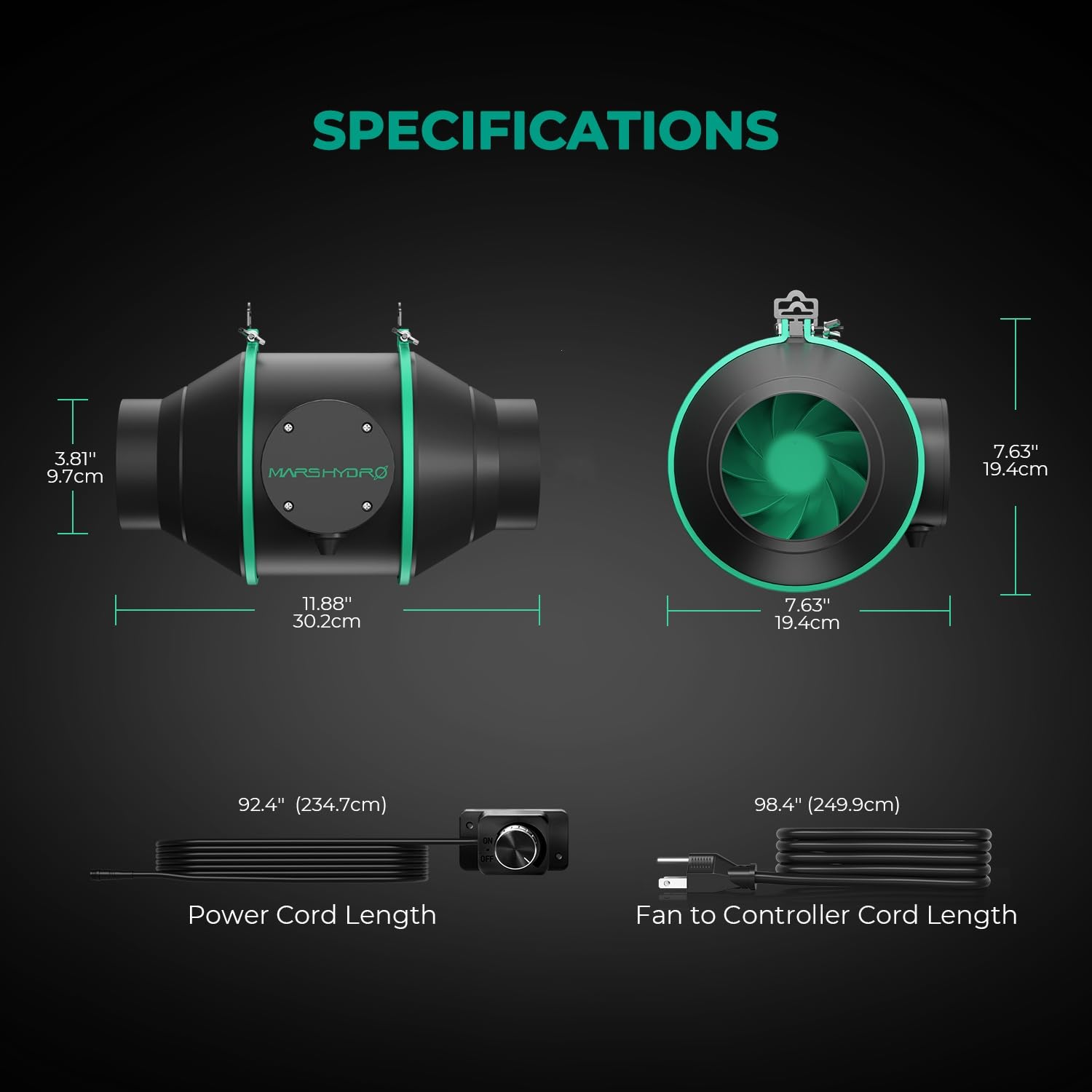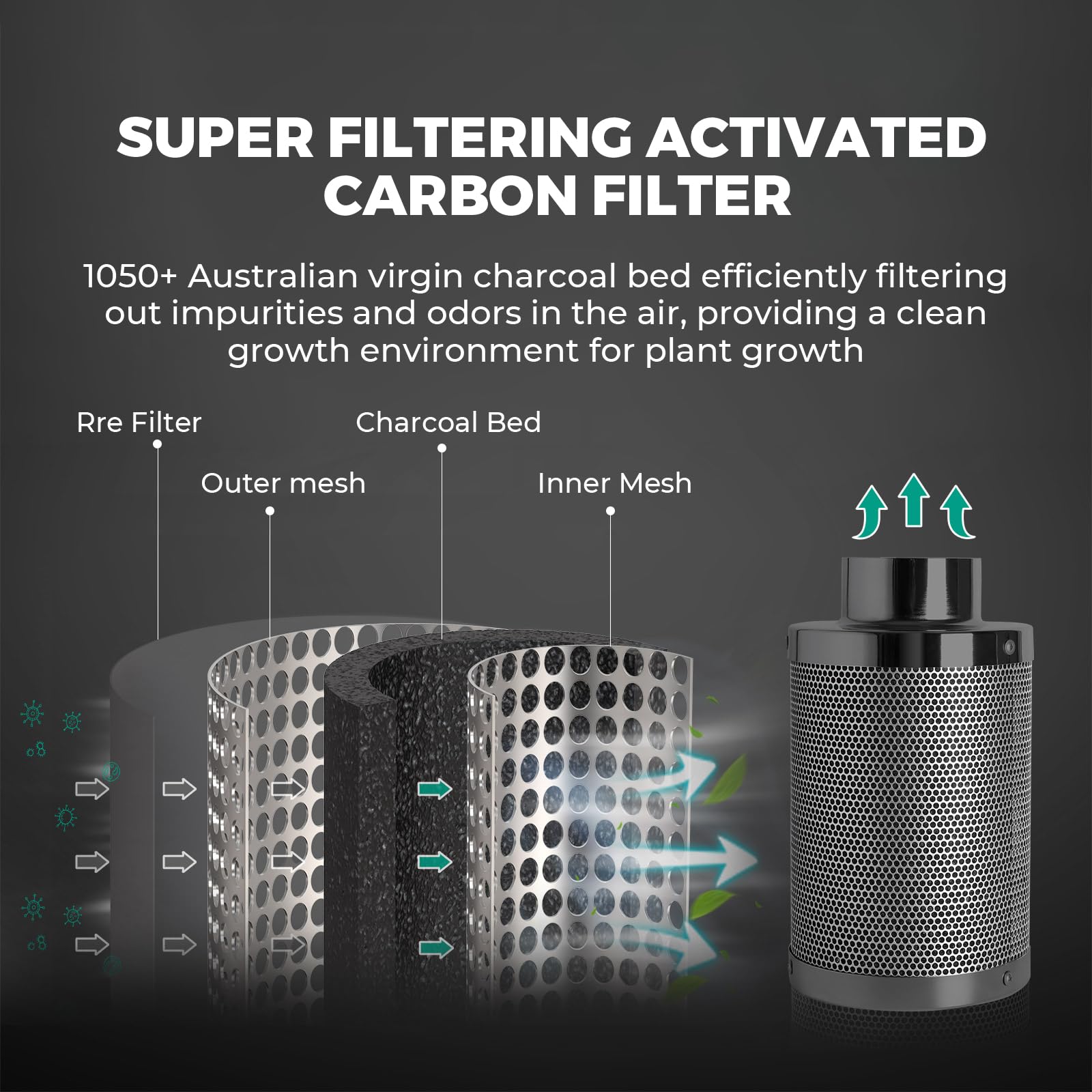 【ADJUSTABLE&EFFICIENT VENTILATION SYSTEM】Fan Speed 2550RPM , Airflow: 205 CFM , Noise: 26.8dB. Upgraded Inline Fan with EC motor & metal case &0 to100% speed controller, more durable & safer to use! 4" Fan Carbon Filter; 1050+RC 48 Australian virgin charcoal, equipped with 25 ft long flexible pipes, quickly and effectively transports air, effectively filters impurities and odors in the air.