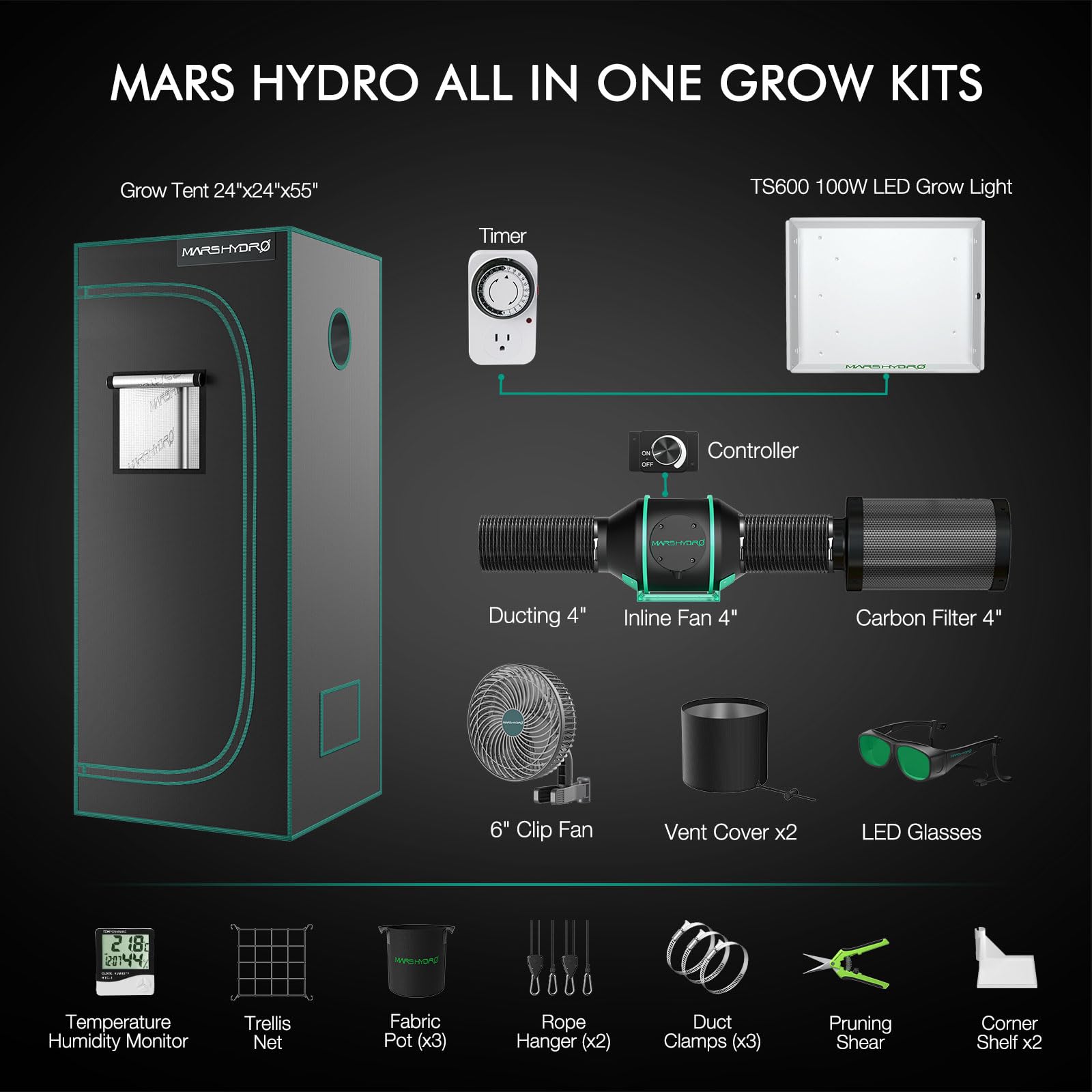 MARS HYDRO 2x2 Grow Tent Kit Complete System with 10 Speed Clip Fan,100W TS600 LED Full Spectrum Grow Light,24"x24"x55" 1680D High Reflective Mylar Grow Tent,4 inch 205 CFM Smart Ventilation System