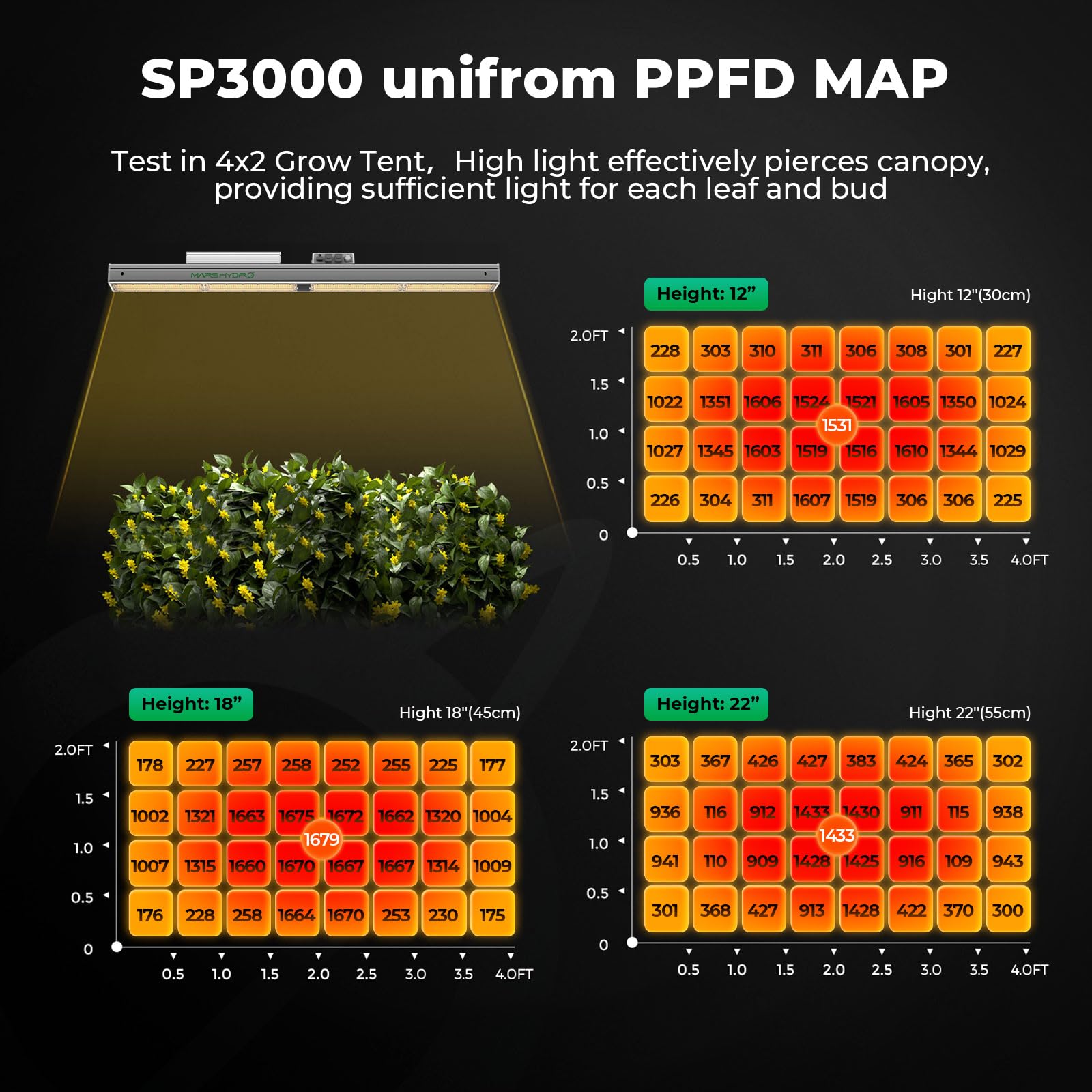 【Upgraded High Yield & Energy Saving】The new SP3000 adopts advanced LED technology, boosts energy efficiency, reduce electricity costs, offers uniform lighting and stronger light output, delivering a high PPF of 727.2 umol/S and efficiency of 2.8 μmol/J, specifical for greenhouse or 4x2 grow tent lighting. The light intensity is efficient to penetrate deep into the canopy of plants, providing ample light to every leaf and bud.