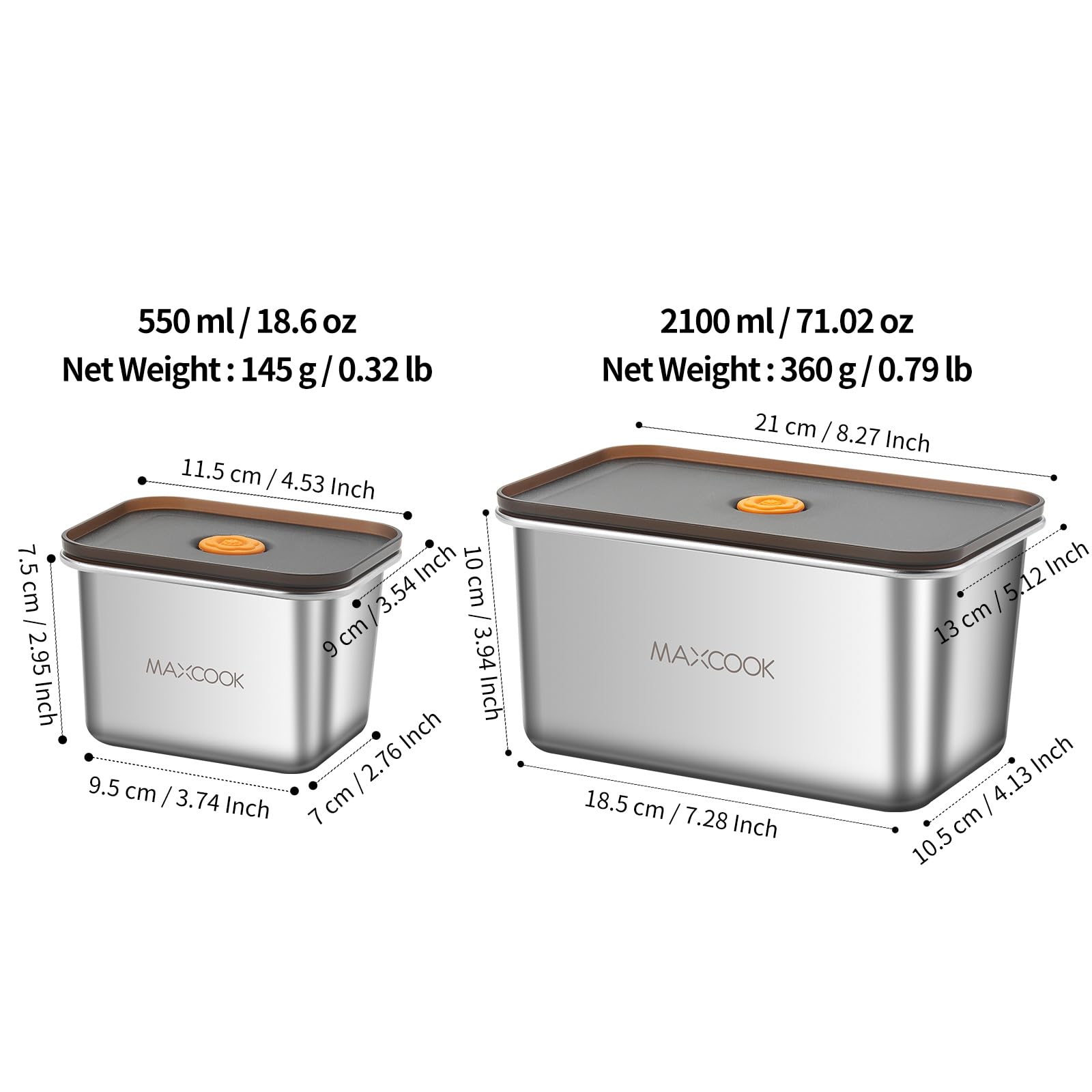 MAXCOOK Stainless Steel Food Containers with Lids, 18.6 oz & 71 oz Food Storage Container set, Metal Food Container Bento Box, Snack Container set with Lid,Dishwasher & Freezer Safe(2100 ml & 550 ml)