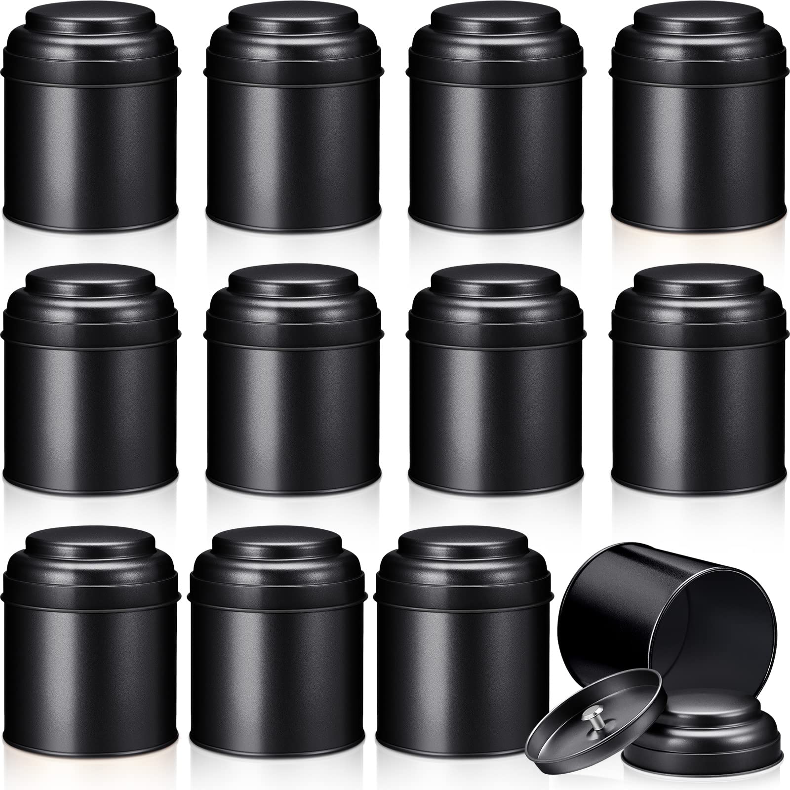 Satisfy Your Large Needs: you will receive 12 pieces of tea tins for loose tea in black, each size is about 3 inches/ 7.5 cm in diameter, about 3.6 inches/ 9 cm in height, and the capacity is about 8 oz; Enough quantity and appropriate size are suitable for storing tea, candy, nuts, etc., to meet your various needs