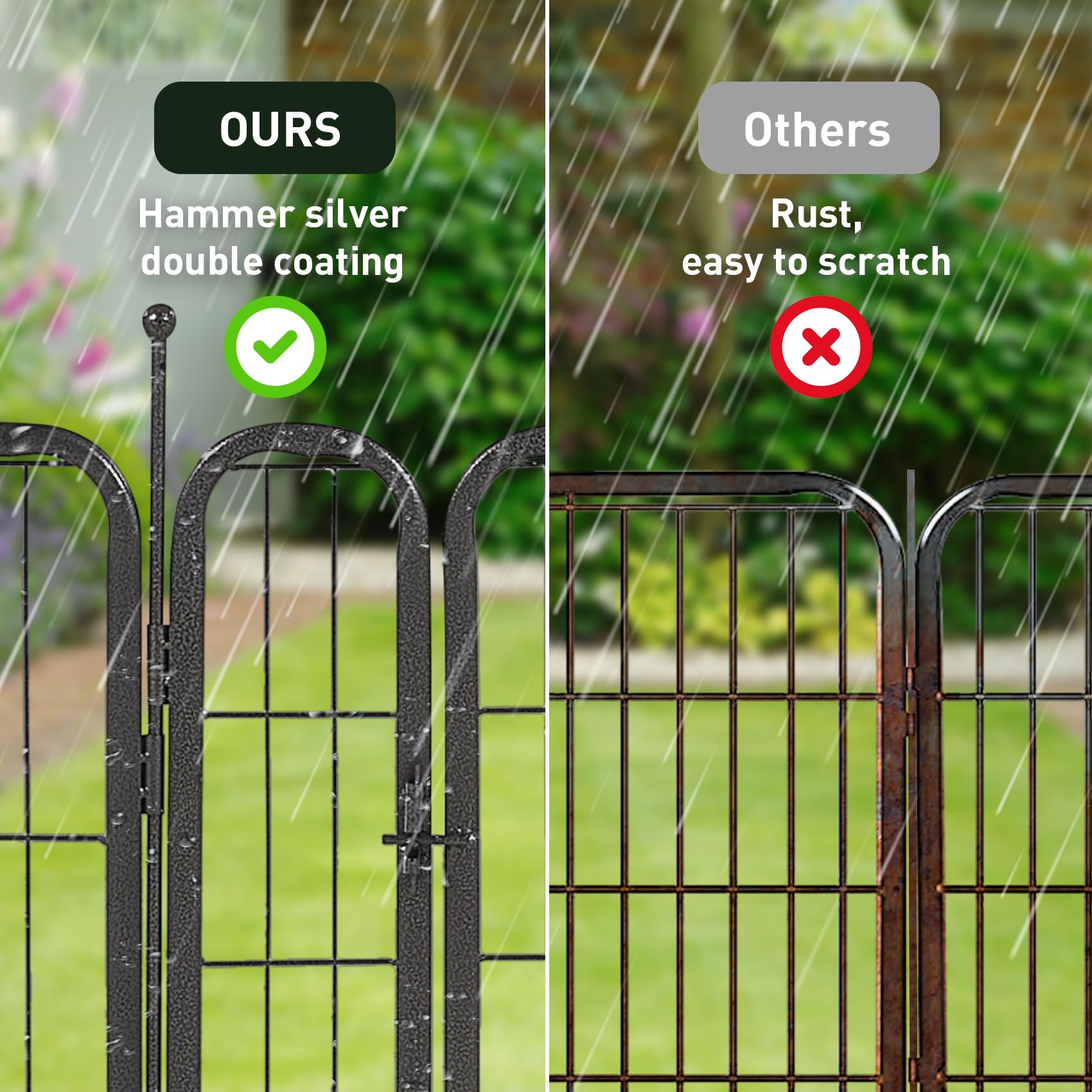 【Hammer Coating】Pet Fence's surface has two layers of hammer pattern coating. The coating has a smooth silver-black surface, and is not easy to peel and rust. It can be placed in all kinds of weather.