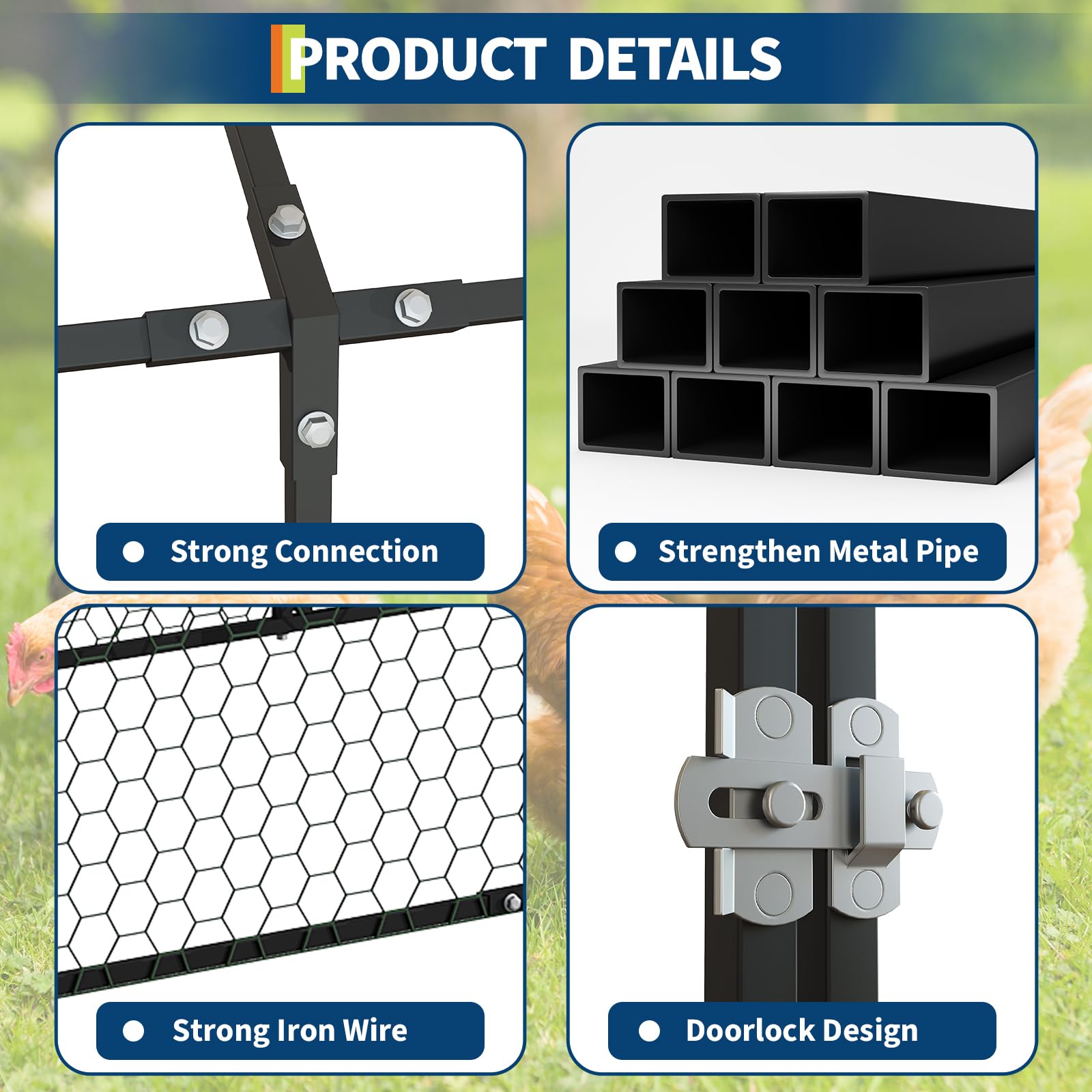 【Easy Assembly & Low Maintenance】 Includes clear assembly instructions for quick setup. The rust-resistant metal requires minimal upkeep, making this large chicken coop for backyard a hassle-free choice for homesteaders.