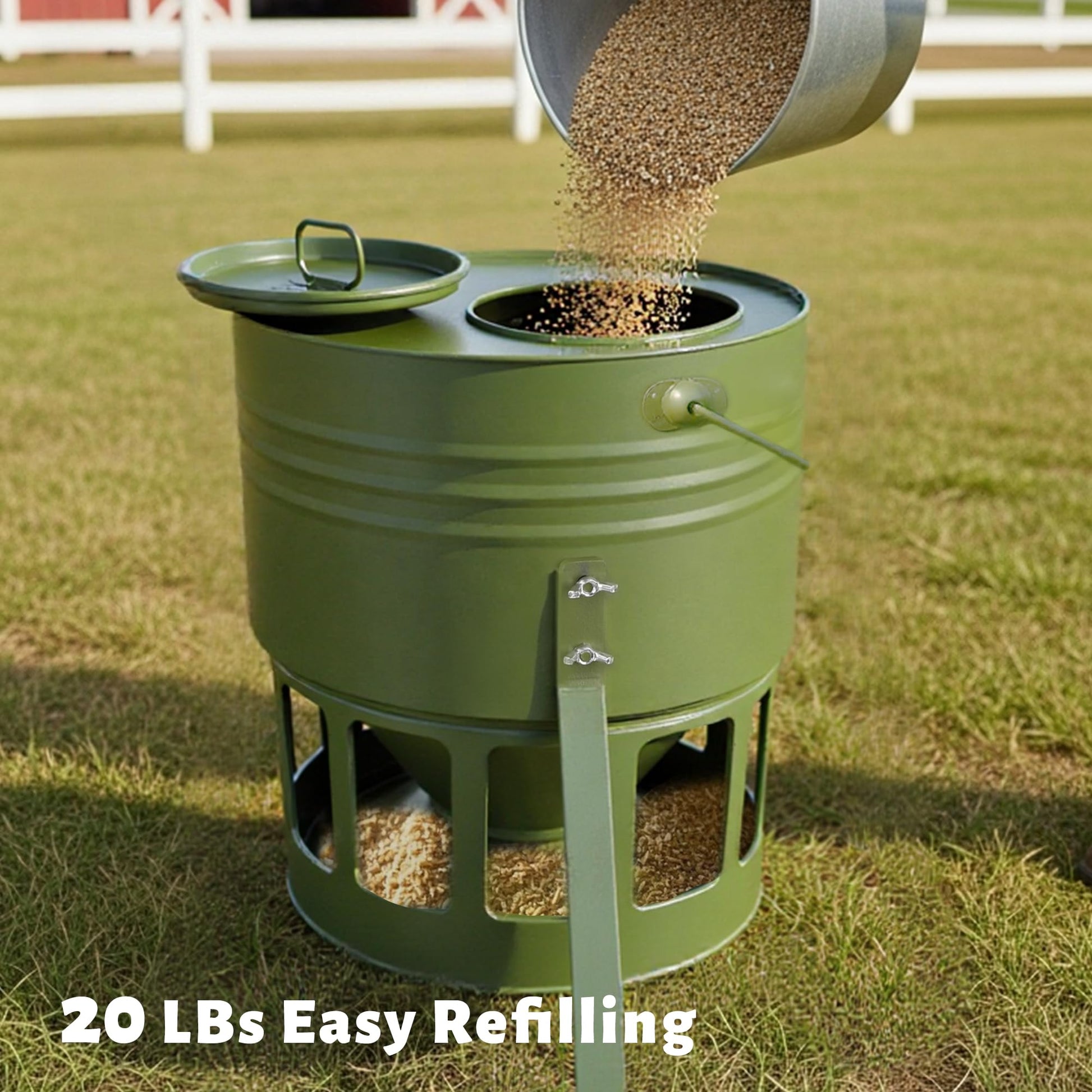 Large Capacity & Durable Ground Design: This 20lbs metal chicken feeder reduces frequent refilling and features a sturdy ground-mounted structure, perfect for flocks of all sizes. The powder coating ensures rust and corrosion resistance for long-lasting outdoor use.