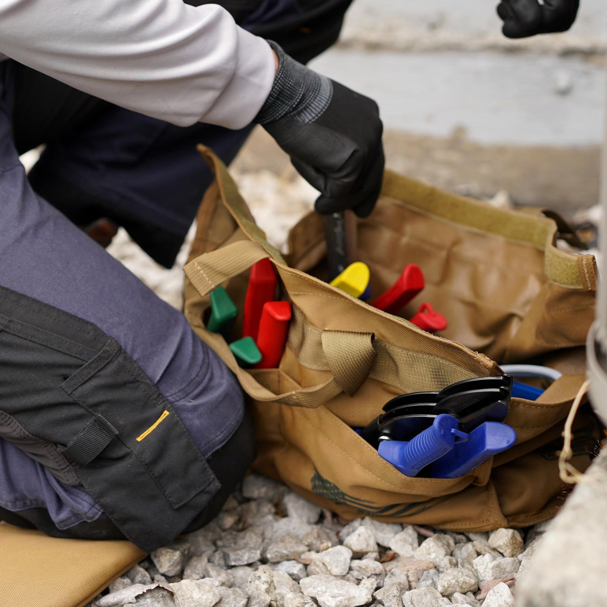 WATER REPELLENT & KNEELING PAD - This water repellent tool pouch keeps your tools organized and easily accessible on the job site. The lightweight design even includes a removable kneeling pad to reduce strain on your knees as you work.