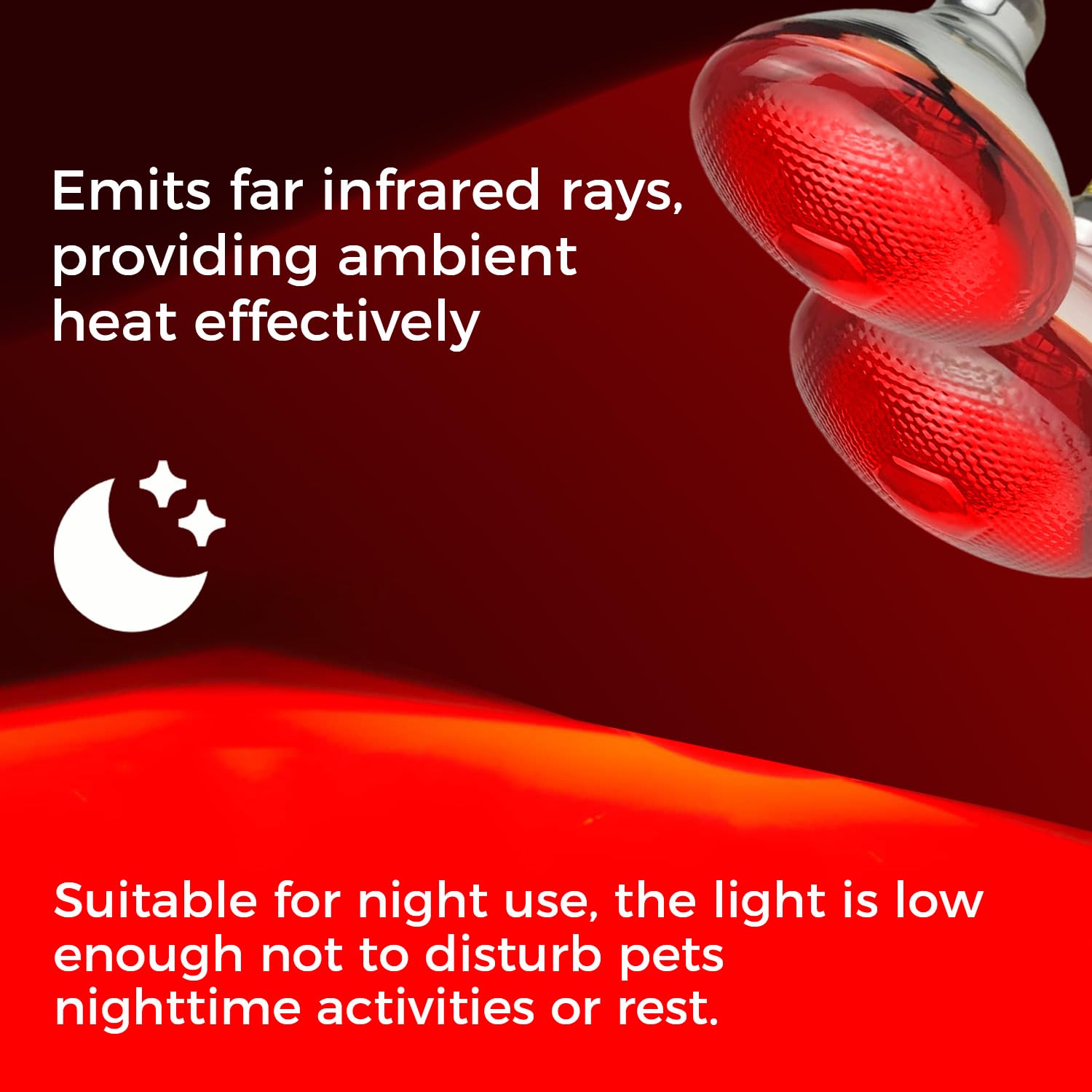 Fast & Efficient Heating: Designed with advanced heating technology, this heat light bulb quickly raises temperatures within minutes.Our infrared heat lamp provides 24/7 warmth for animals requiring constant heating (chickens, cats, dogs, reptile pets)