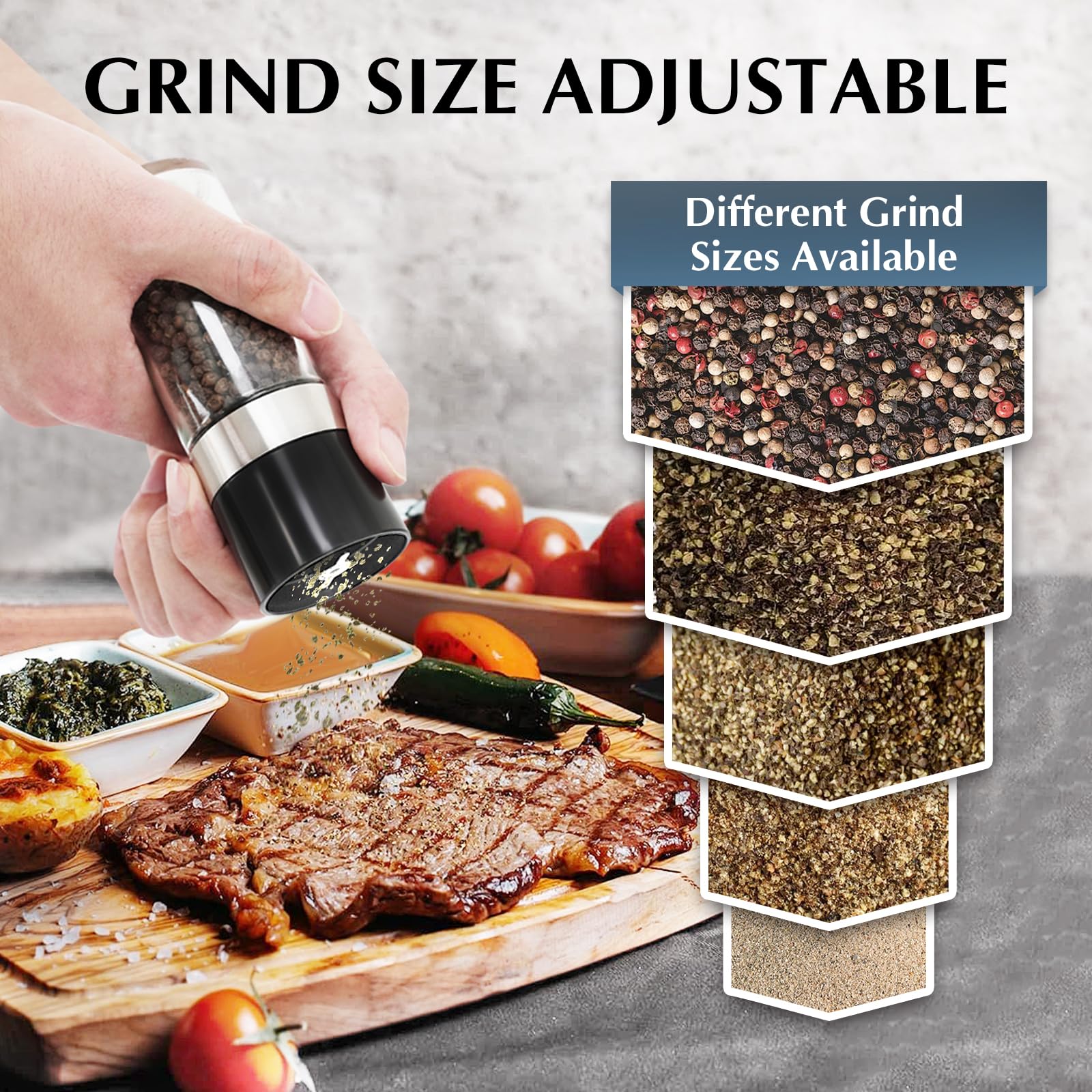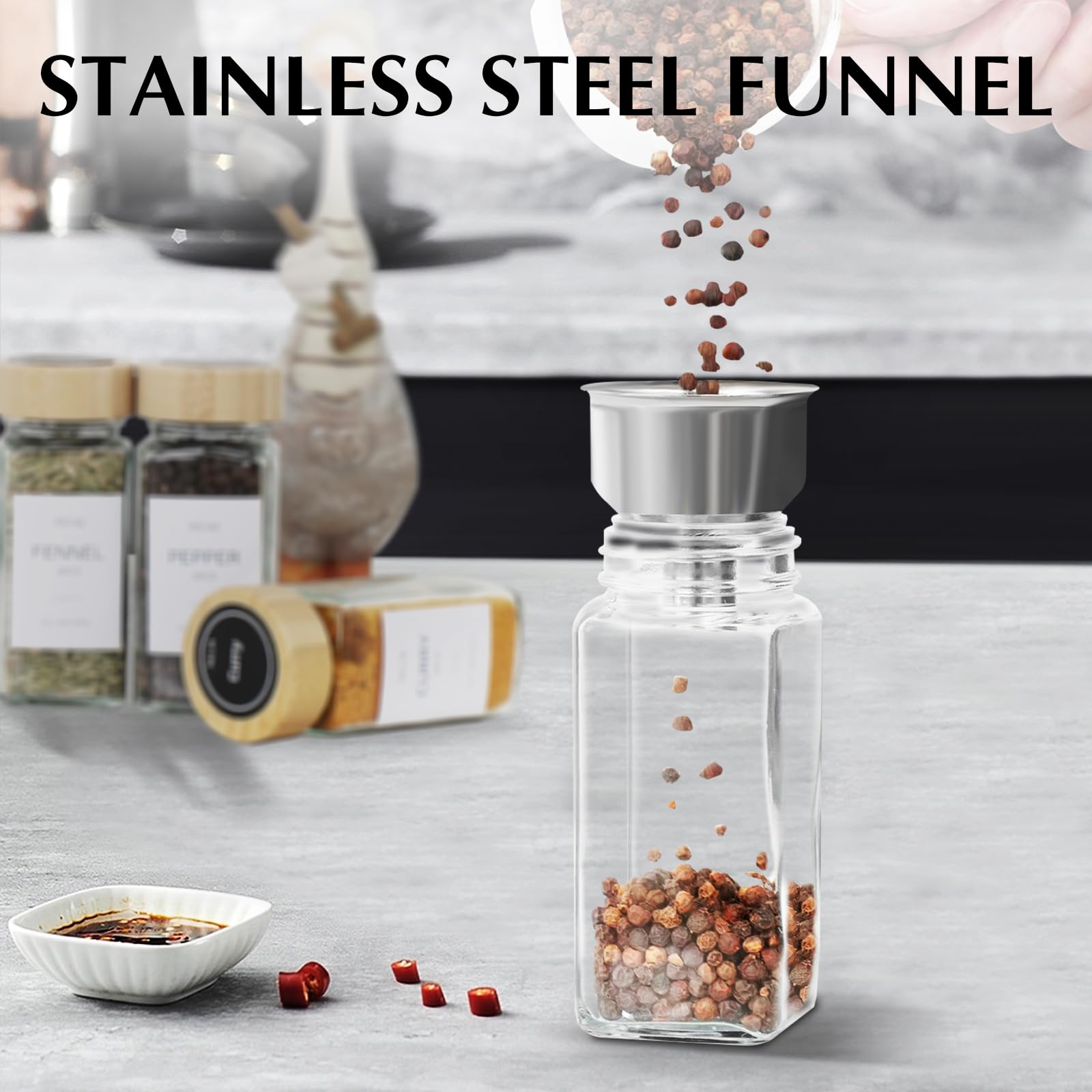 🧂【Stainless Steel Funnel & 2Pcs Salt and Pepper Grinder Set】Equipped with 2 Salt and Pepper Grinder Sets and a stainless steel funnel, our glass seasoning containers provides a better solution for spice organization. An modern and user friendly addition to your kitchen!