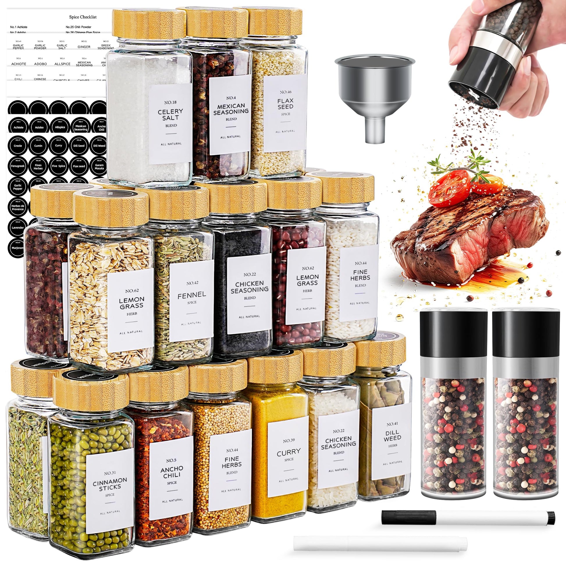 🧂【Complete 26 Pcs Spice Jars Set】Package Contains: 24 Square Glass Spice Jars(4oz), 2 Salt and Pepper Grinder Set (2 round 3oz glass jars & 2 grinders included), 24 Shaker Lids, 24 Bamboo Lids, 108 Round Black Labels (A-M Spice Names, 36 blank labels included), 96 Square White Labels(A-M Spice Names, 24 blank labels included), 1 White Marker & 1 Black Marker, and 1 Stainless Steel Funnel. With all necessary accessories provided in one pack, no other purchases needed!