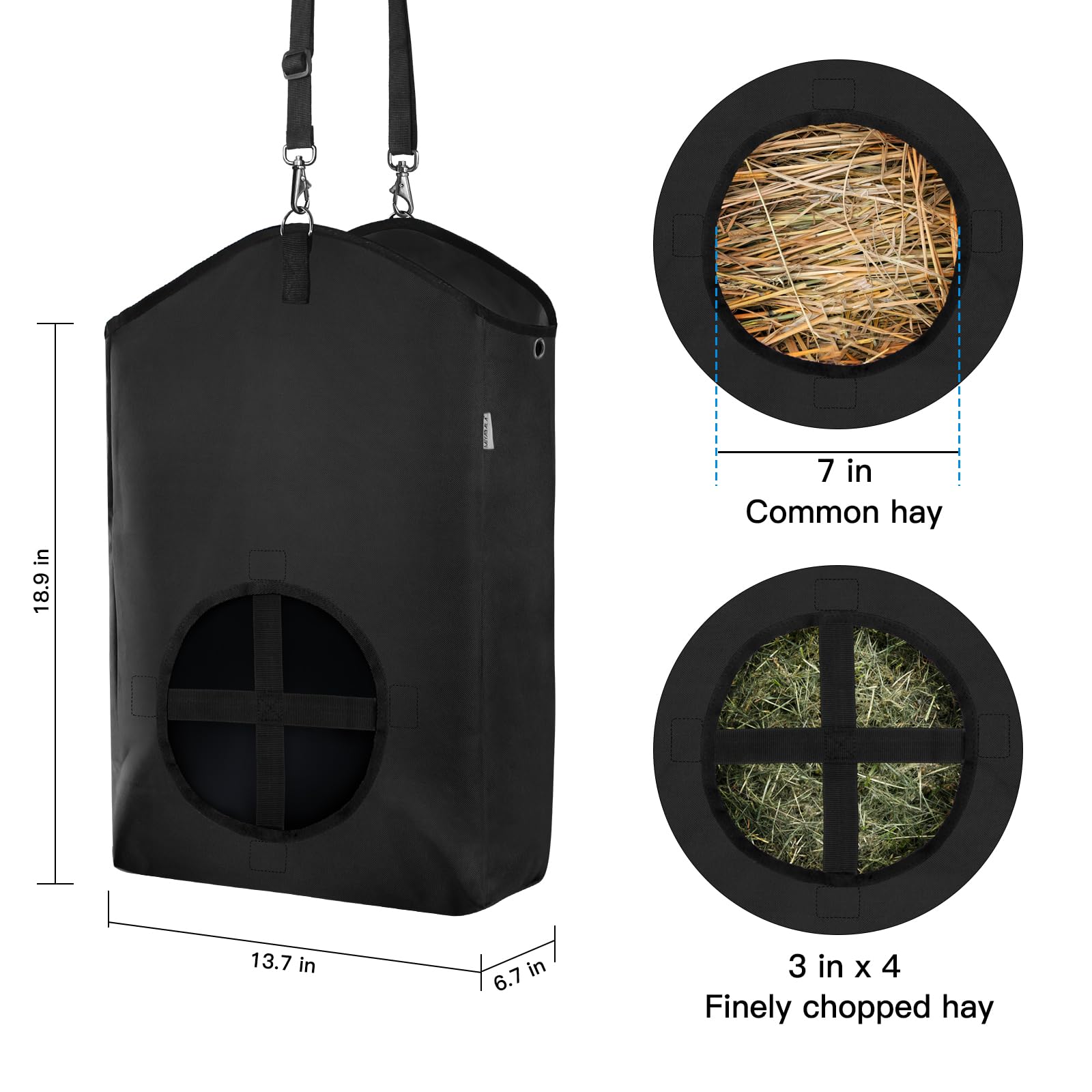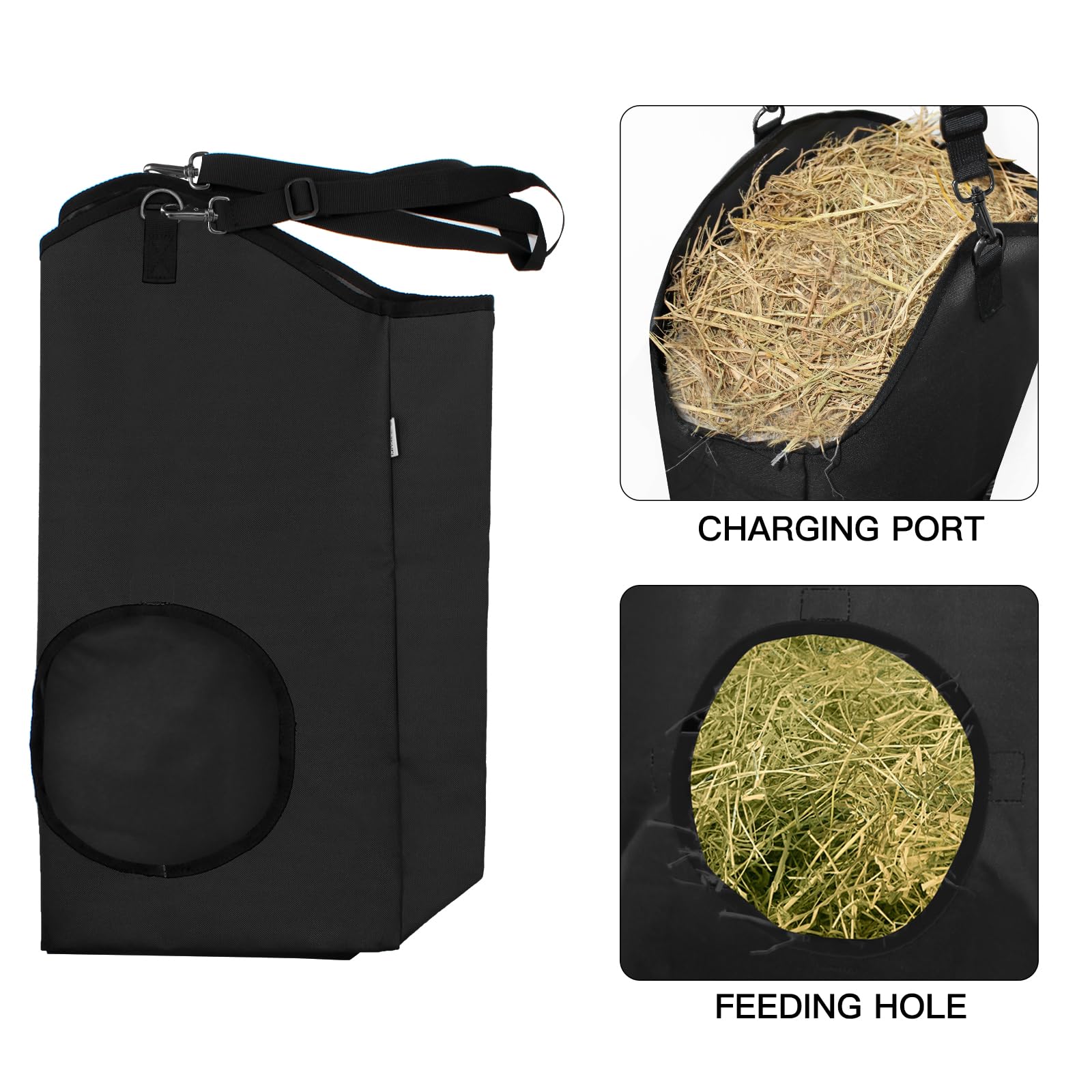 Specifically designed for storing hay and feeding goats, this hay feeder bag is also suitable for horses, donkeys, cattle, and other livestock. Its large top opening makes loading hay a breeze. Whether you hang it indoors, outdoors, on trees, in corrals, or pastures, this versatile bag is a reliable choice for convenient feeding.