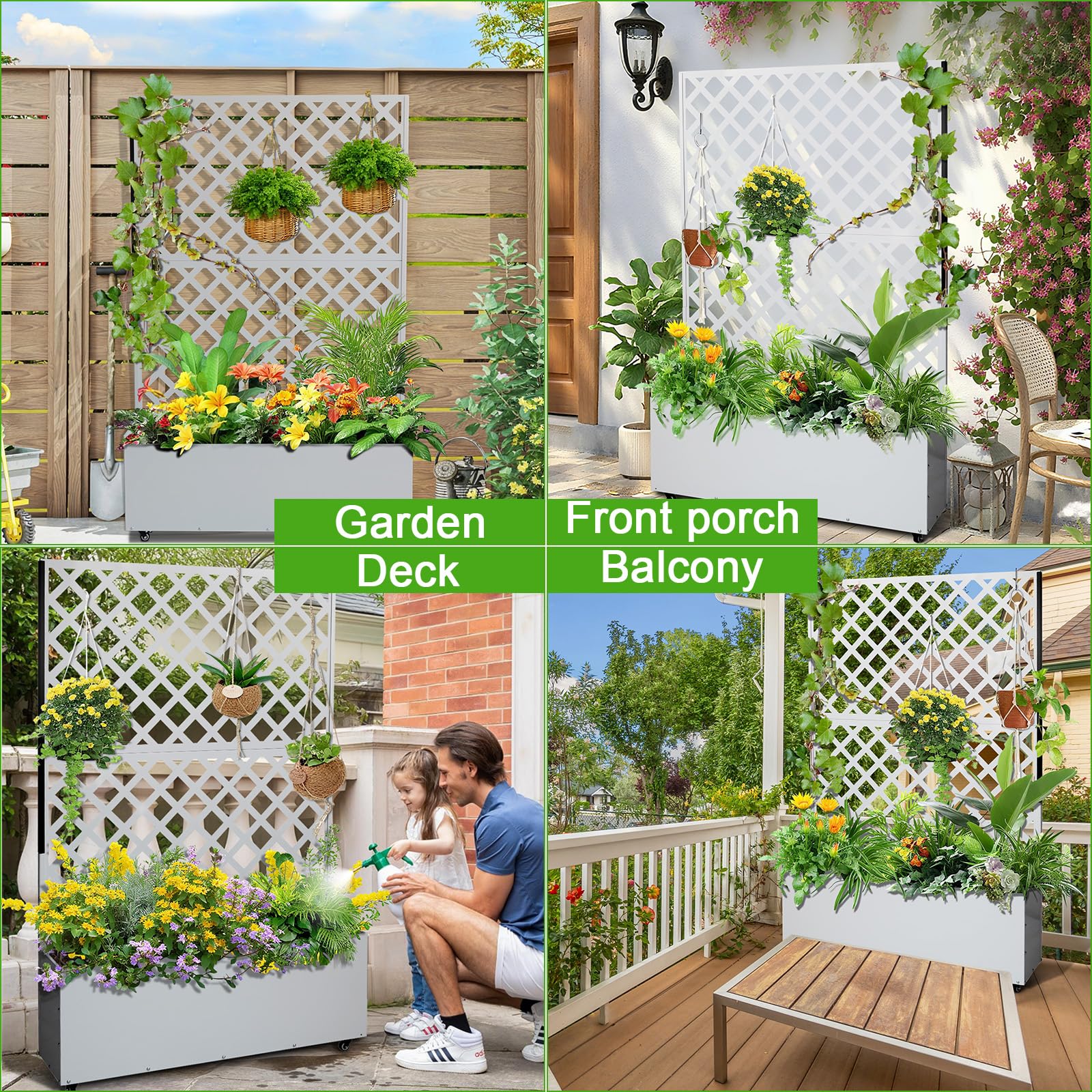 Mochalight Metal Raised Garden Bed with Trellis and Wheels, Metal Planter Box with Trellis Privacy Screen, Outdoor Planter Box with Drainage Holes for Climbing Plants, Flowers, Vegetables, White
