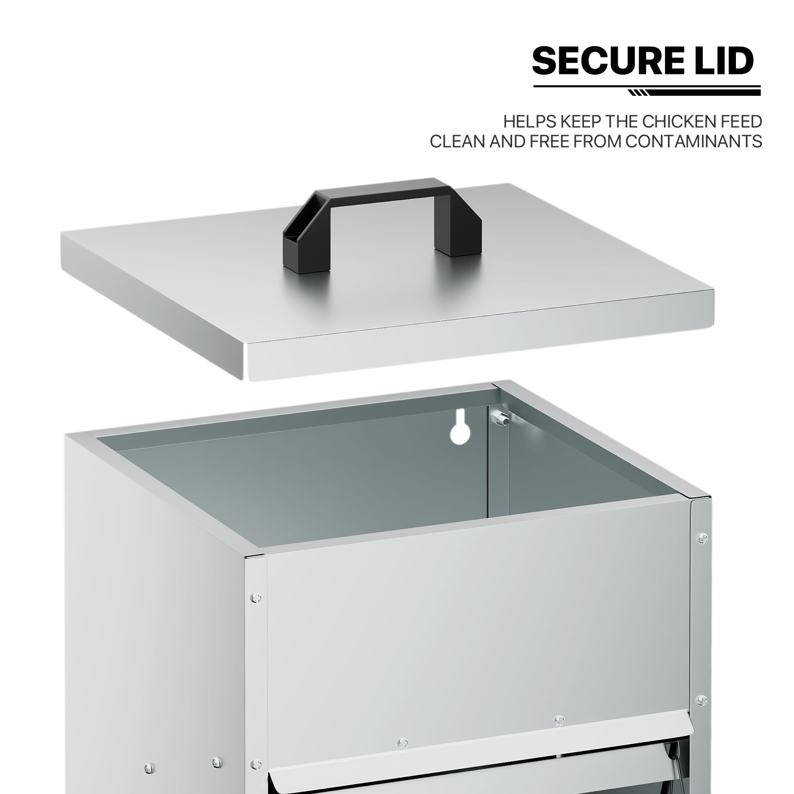 Weatherproof Lid: The feeder is equipped with a weatherproof lid that protects the feed from rain and other elements, keeping it dry and fresh