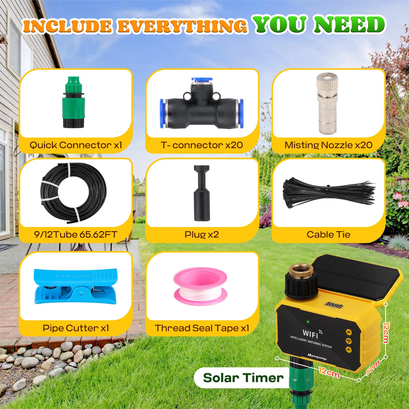 Moongiantgo Outdoor Misting Cooling System with Solar WiFi Water Timer, Misters for Outside Patio with 65.5FT(20M) Water Pipe+20 Misting Nozzles 0.02’’, Mister System for Outside Patio Garden Beaches