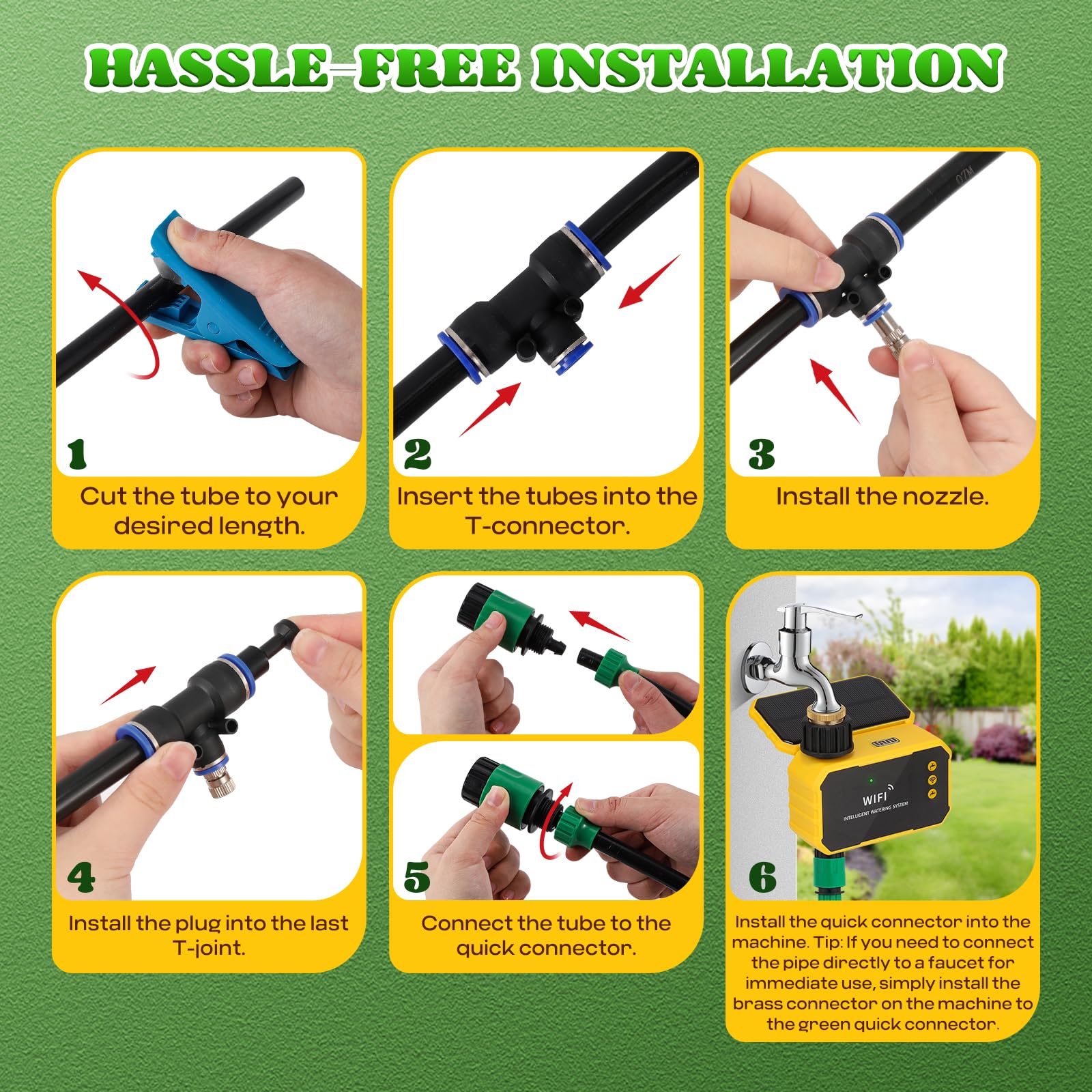 Tips 1 Please note that the device comes with only one green quick adapter. 2 Before use, it is recommended to run the system for about one minute to ensure smooth water flow. 3 Our solar water valve is compatible with 2.4 GHz networks or dual-band 2.4/5 GHz WiFi networks.