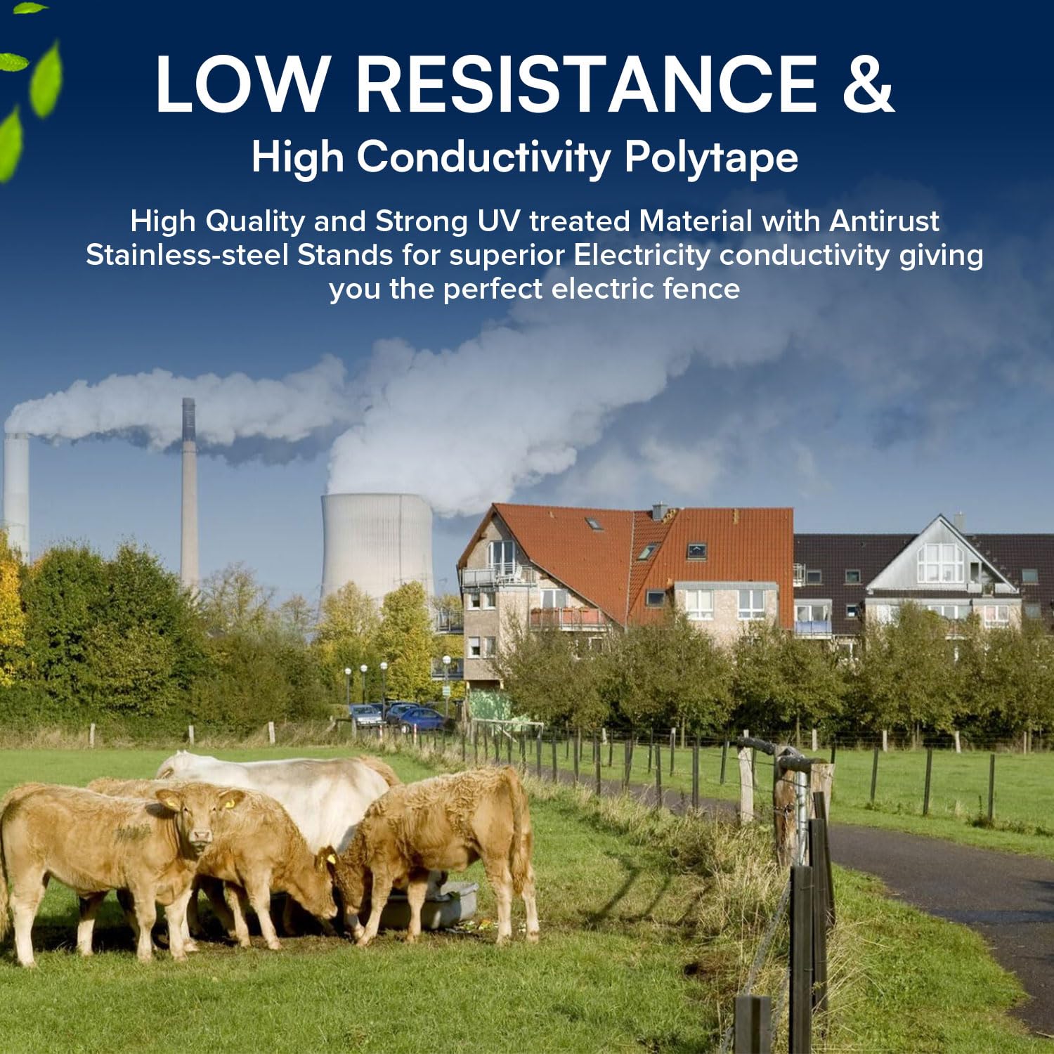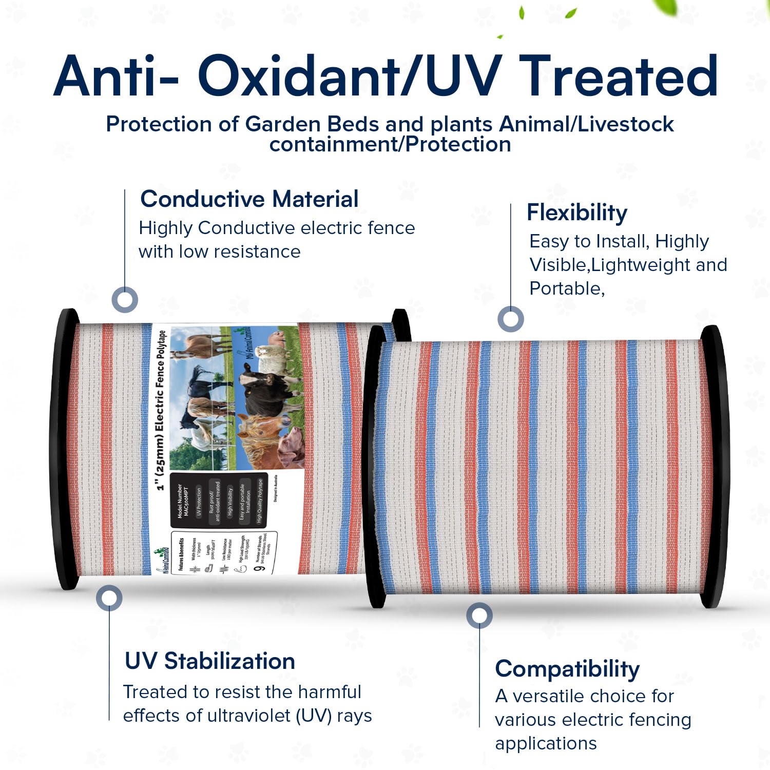 LOW RESISTANCE AND HIGH CONDUCTIVITY ELECTRIC FENCE POLY TAPE: My Animal Command electric fencing polytape consists of 9 inter-woven and highly conductive stainless-steel strands with a low 2.8Ω ohms/meter resistance only. High Quality and Strong UV treated Material with Antirust Stainless-steel Stands for superior Electricity conductivity giving you the perfect electrical fencing livestock