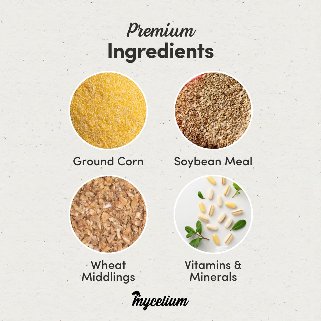 Mycelium Poultry Super Flock Food | High Protein Bird Food with Vitamins & Corn for Chicken, Turkey, Duck & Geese | Supports Growth, Egg Production, Feather & Immune Health | 5 lb Bag