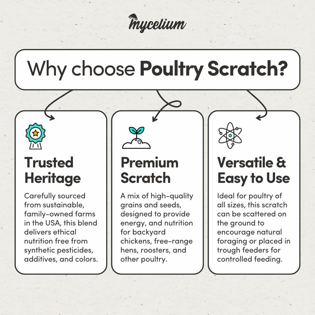 Perfect bird feed for Chickens, Quails & Game Birds: Mycelium Premium Poultry Scratch is a high-energy, nutrient-rich mix formulated for chickens, ducks, quails, and other poultry birds, providing essential nutrition for foraging flocks.