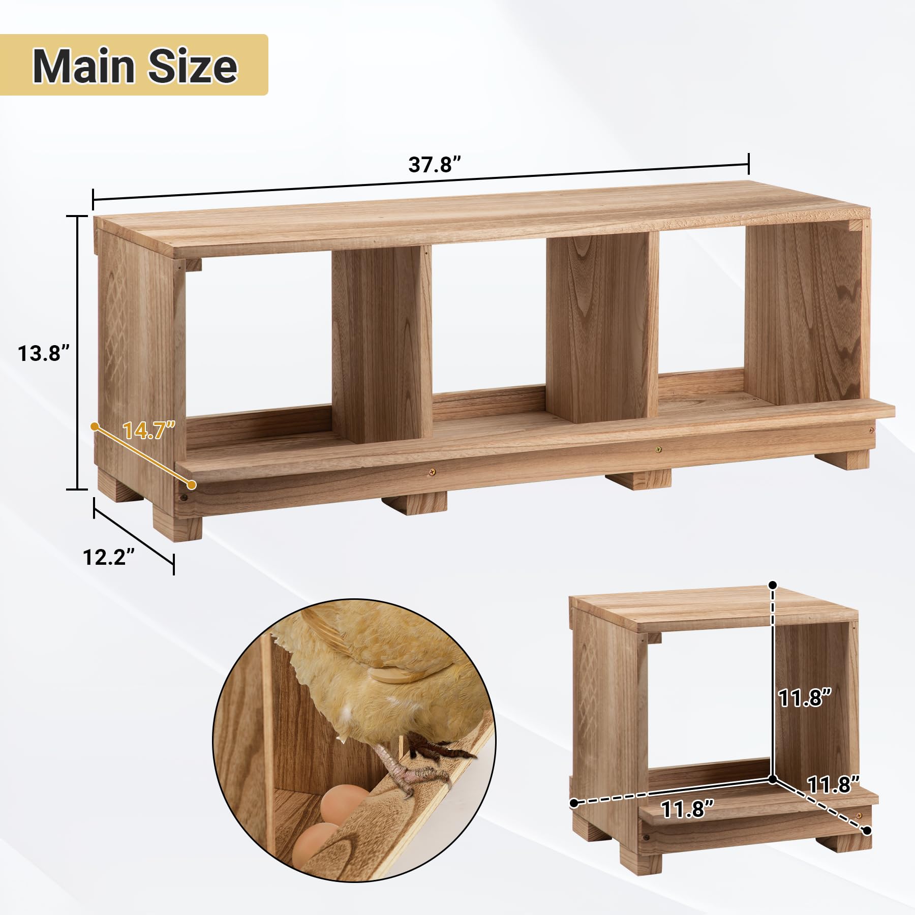 Large Space: The overall size of the 3 room laying box is 37.8” L x 13.8” H x 14.7” D. Each coop has a large space and is widened to 11.8”, suitable for all chicken breeds