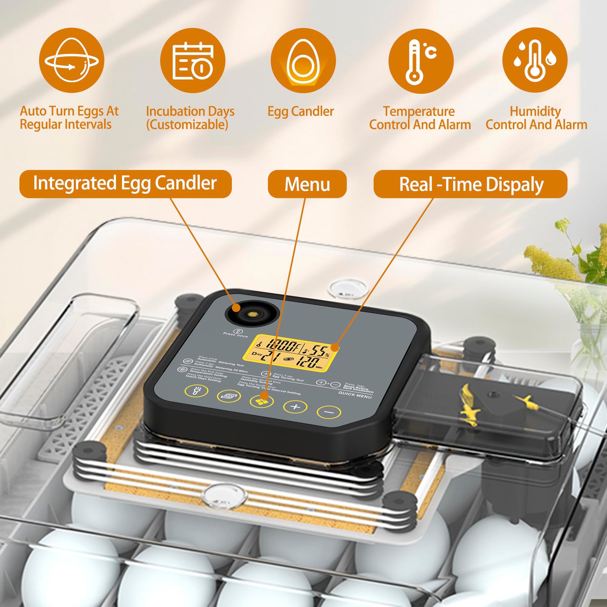 【With Egg Candler for Dark Chicken Eggs and Dispaly for Easy to Use】Our incubator integrates an egg candler for easy viewing of the inside of the eggs, and the control panel has a real-time display for custom settings and parameter display