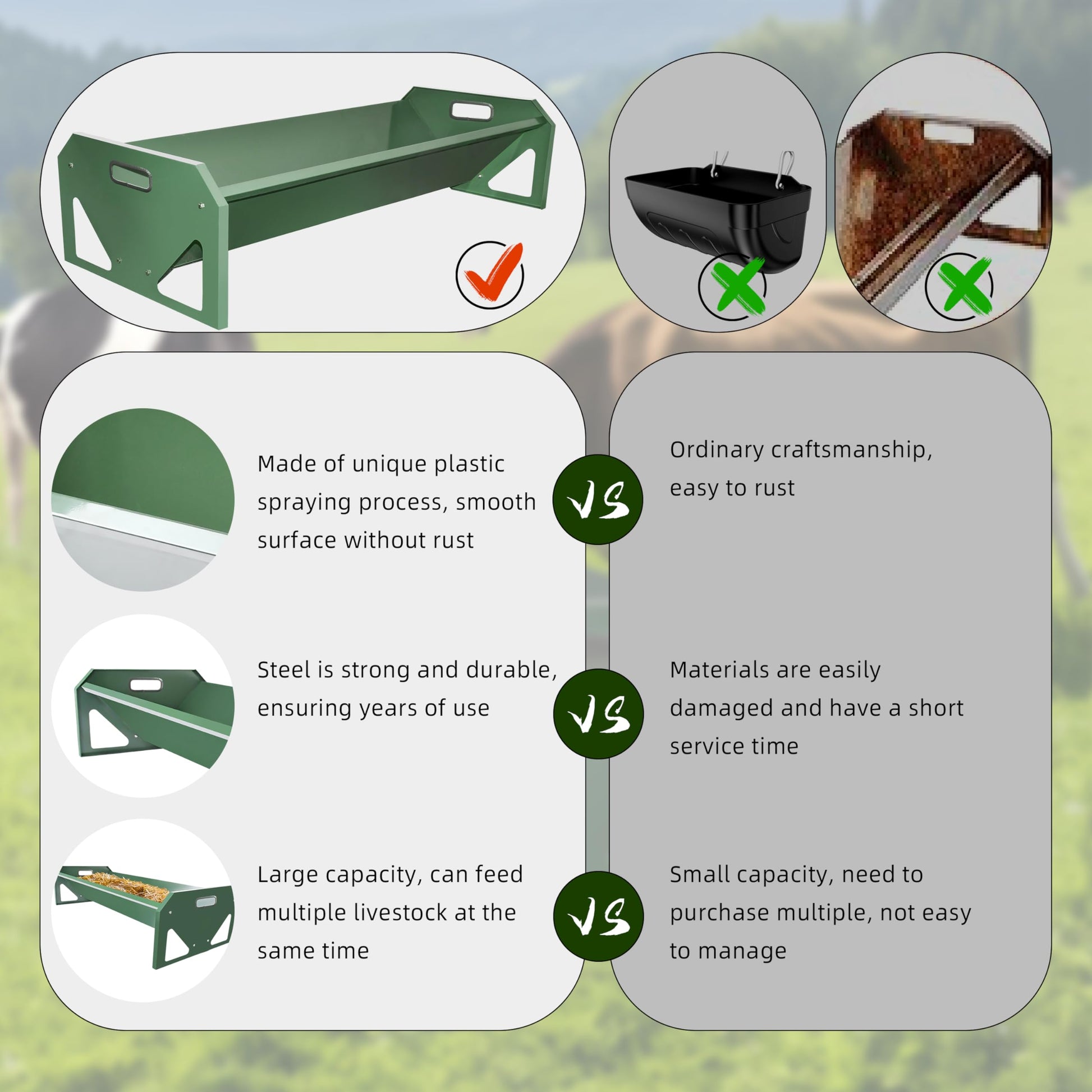 Easy to Clean: Maintaining a clean environment is important for your animals, our livestock troughs are manufactured with a unique plastic spray process with a smooth surface that you can clean with water or wipe with a towel at any time. Meanwhile, our trough feeders are provided with installation instructions and tools to save you installation time.
