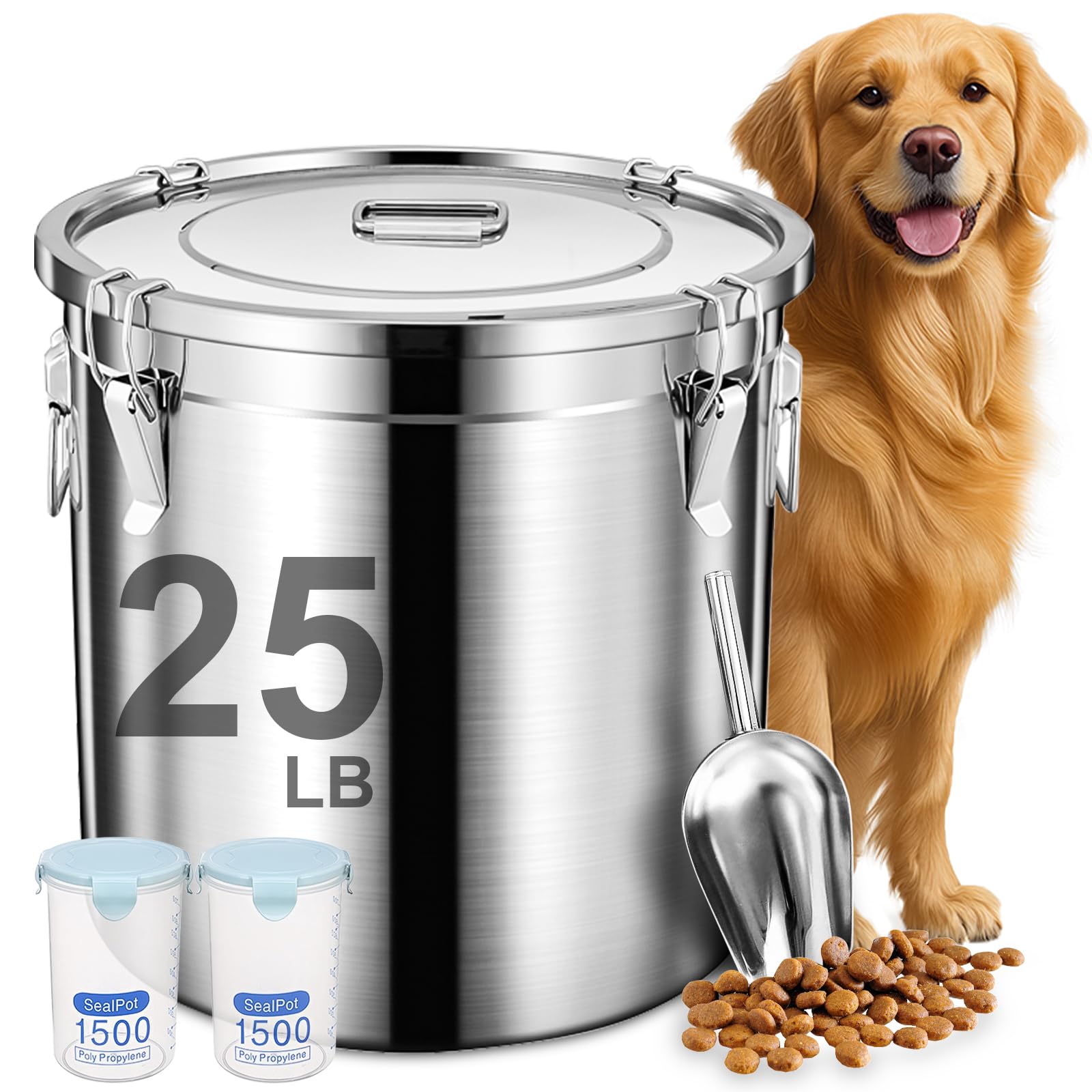 Newget Dog Food Storage Containers, Large Stainless Steel Pet Food Storage Containers 25 lb / 11.5 kg to Keep Fresh, Metal Airtight Cat Food Containers With Scoop and 2 Small Containers