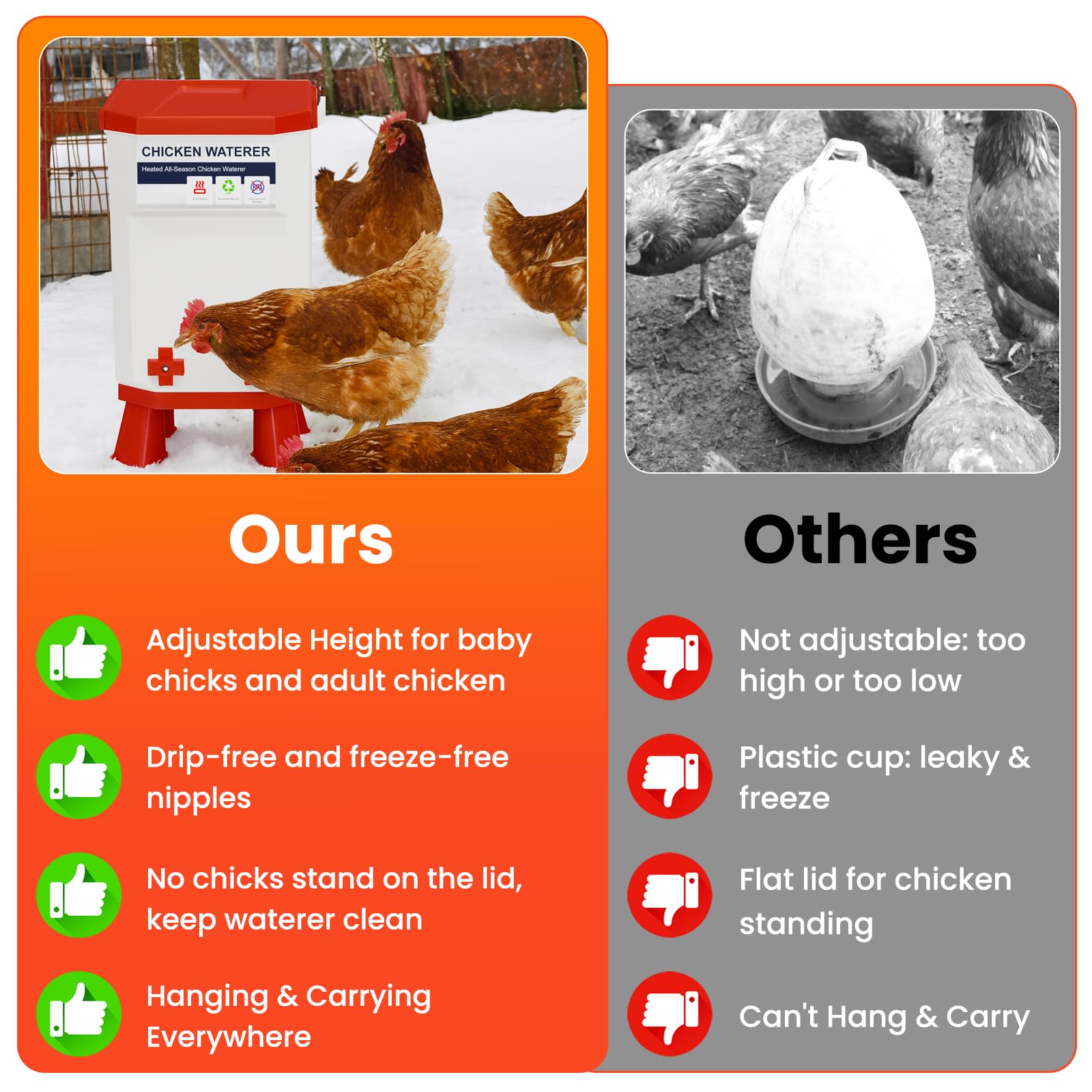 [OCCASION]: The winter chicken waterer is suitable for chicks, hen, ducks, turkey, quail, pigeon and other birds. Whether in a coop or free-range, indoor or outdoor setups, backyard flocks or poultry farms, this all-season heated poultry waterer keeps every bird hydrated. So whether you're a hobbyist or a large-scale breeder, the heated chicken waterer is a reliable choice for promoting bird health and happiness