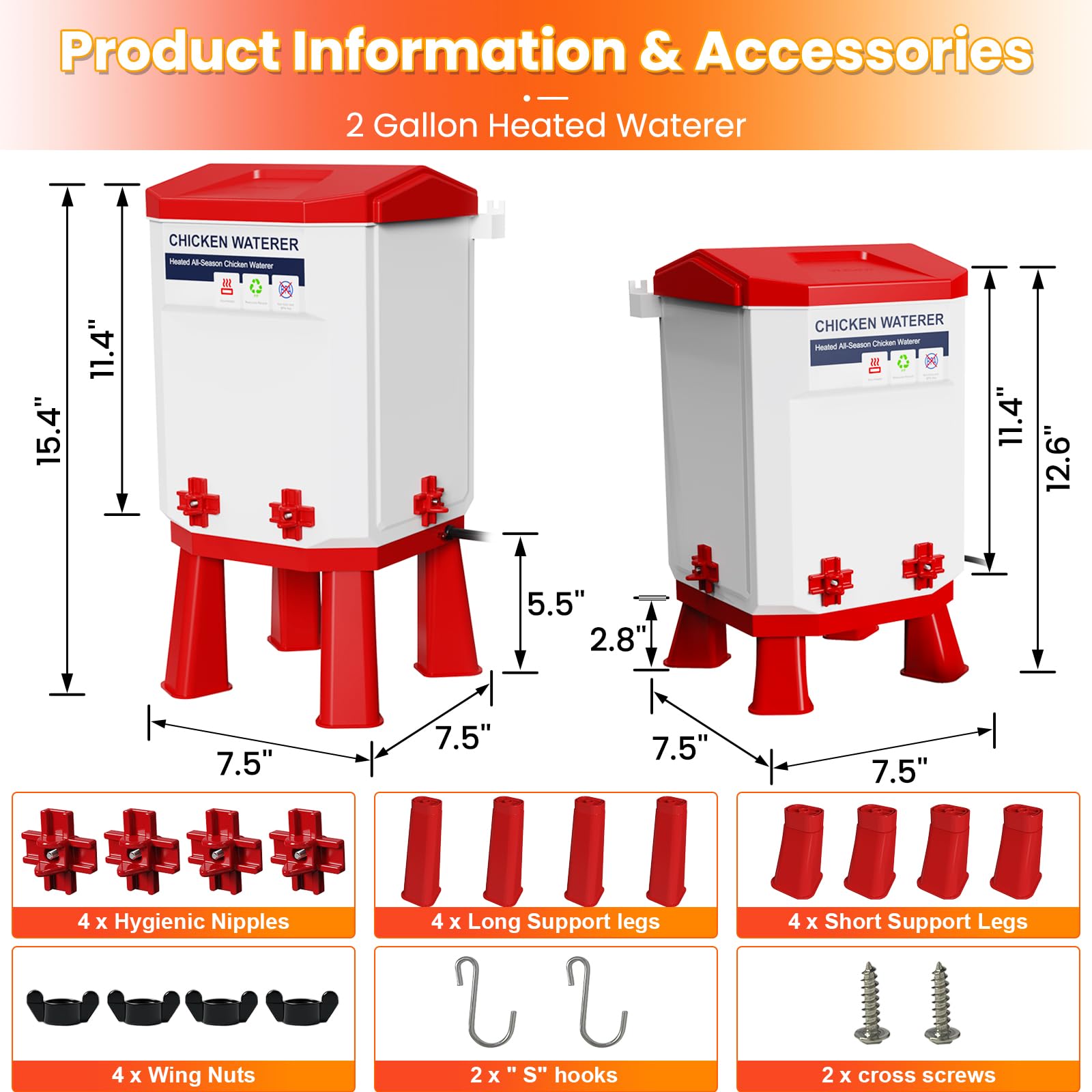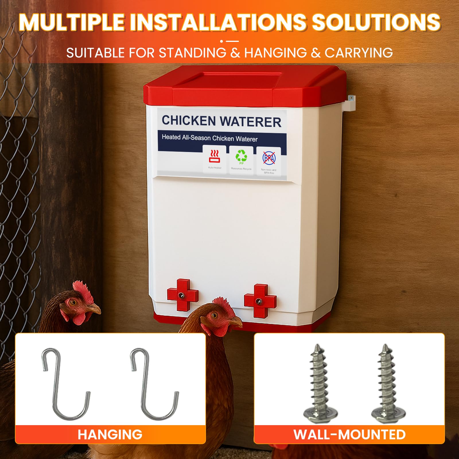 [2 GALLON WATERER]: Our heated poultry waterer is a 2 gallons bucket with 4 leakproof nipples, your chickens can drink around this water feeder without dirtying the water from winter to spring to summer to fall; it is easy to refill when you open the lid; less frequent cleaning needed than traditional waterers