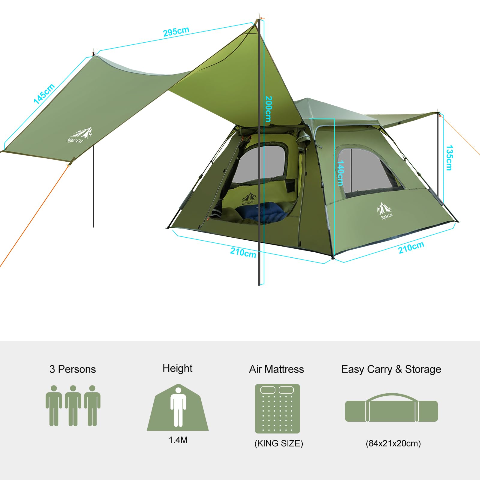 【Spacious Size for 3 Persons】Tent Inner size: 210x210x140 cm, fits well with king size air mattress or Night Cat double sleeping air pads, spacious roomy for 2 adults of family or friends, and 1 to 2 more kids playing aside.Ideal family tent for outdoor camping.