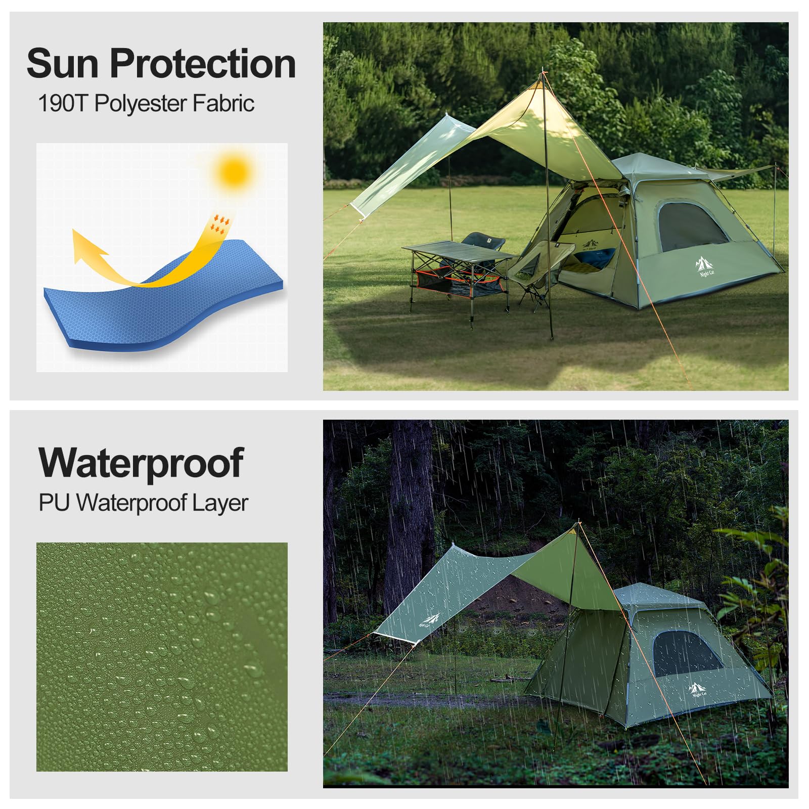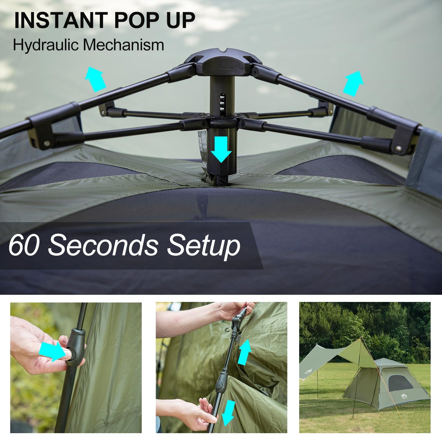 【Easy Instant Setup】Advanced Hydraulic pressure mechanism with assembled poles makes it instant set up automatically in 60S, totally free you from the hassle of manual assembling poles and fumbling with tricky connections, even a child can do it quickly.