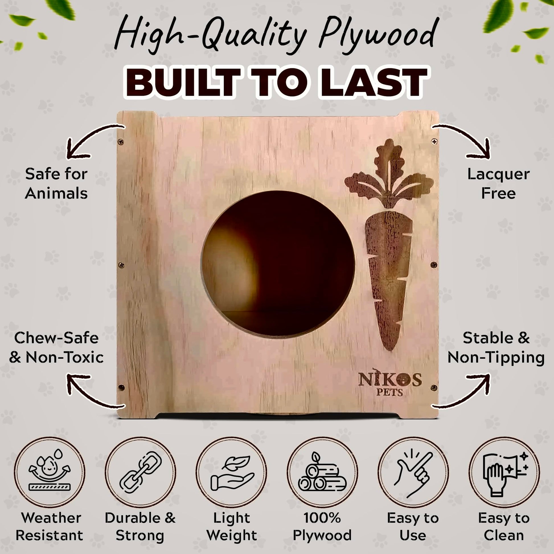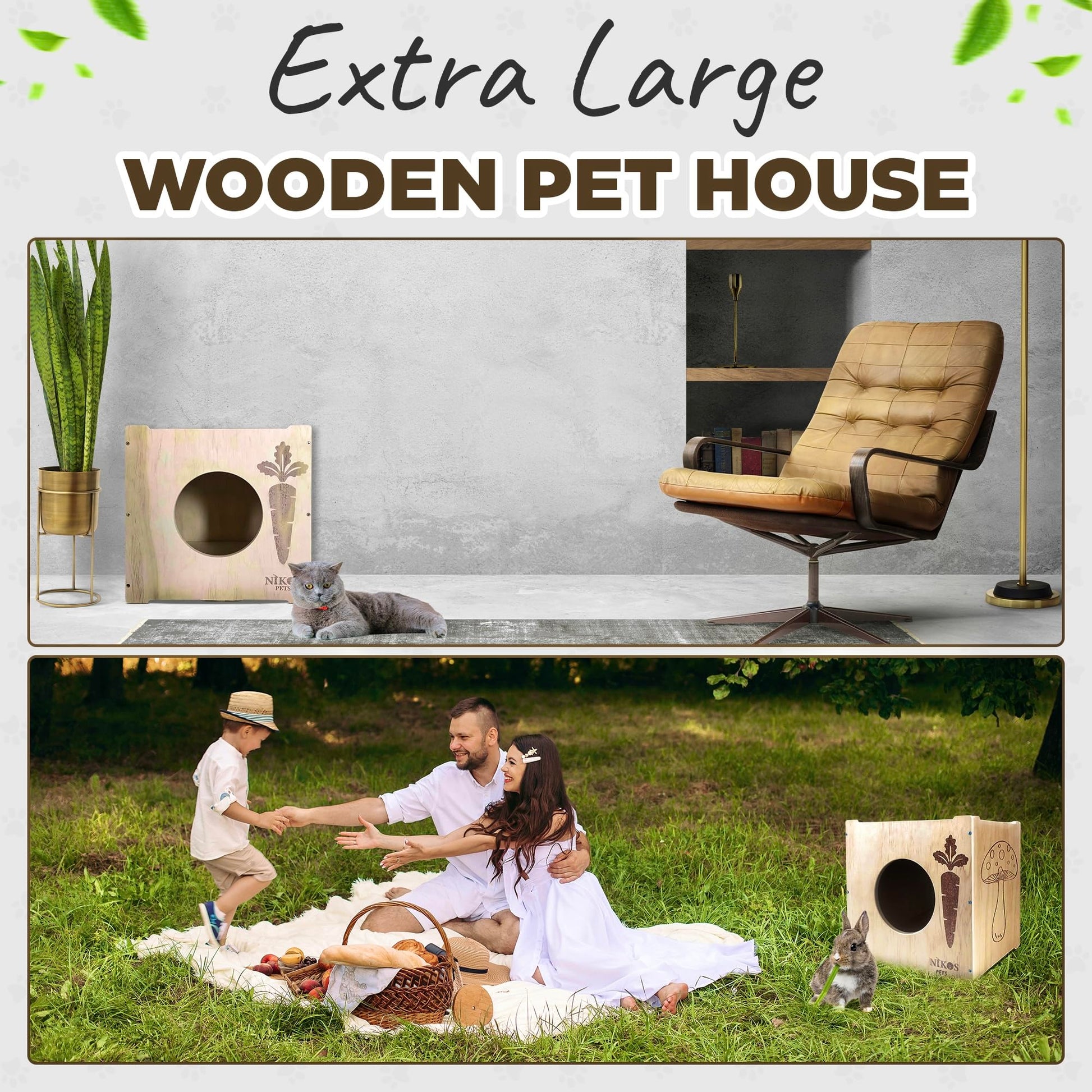 NATURAL, DURABLE & ECO-FRIENDLY Crafted from untreated wood, this chew-safe shelter is free of chemicals and built to last indoors or outdoors. It functions as both a bunny enclosure and a cozy pet bed, and also serves as an indoor hutch — fully biodegradable and designed with sustainability in mind — a favorite among rabbit supplies for eco-conscious owners, doubling as a fun bunny playground.