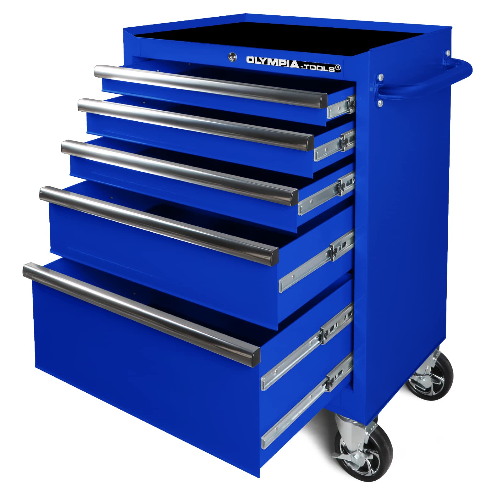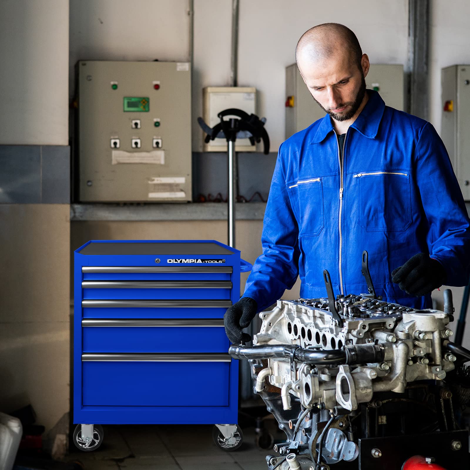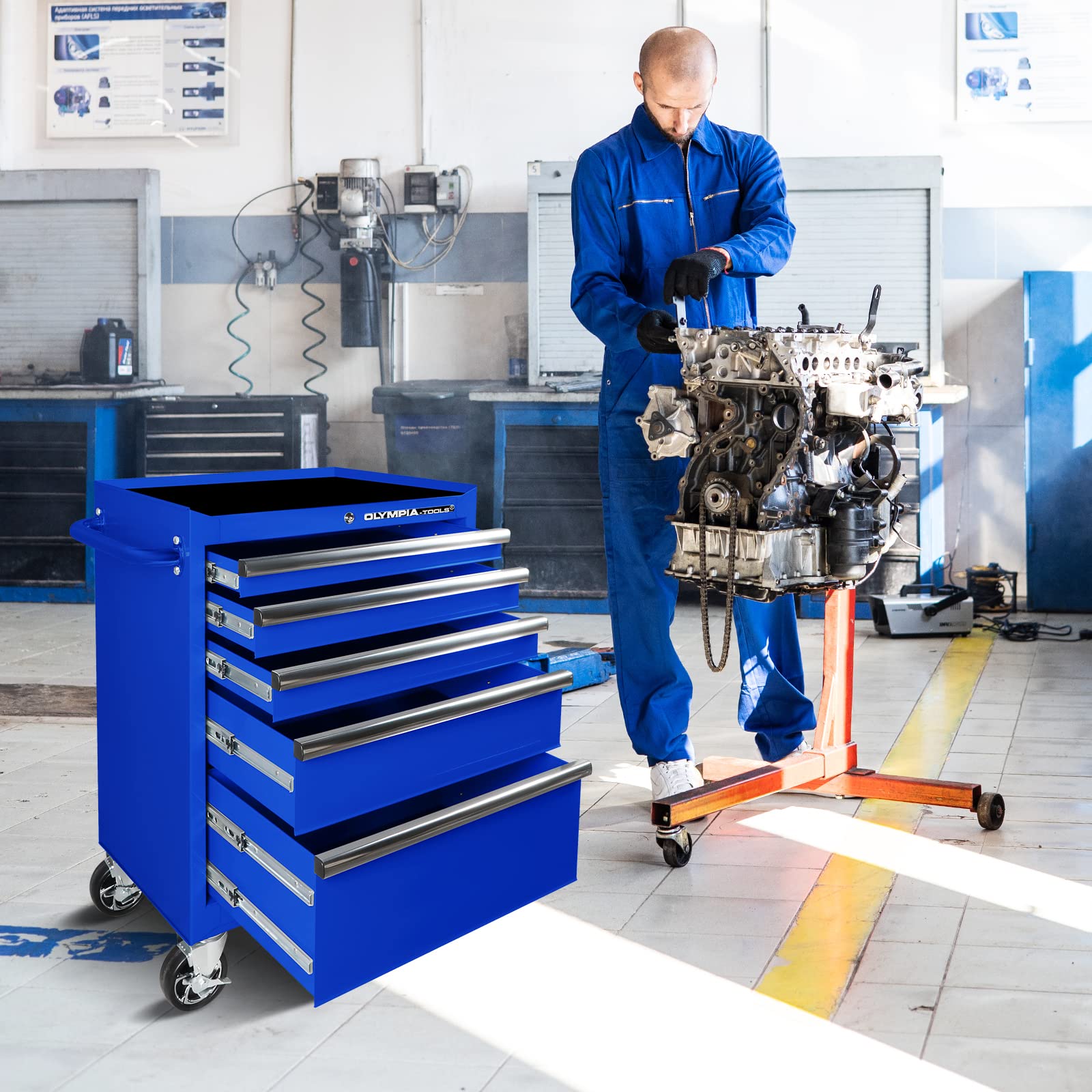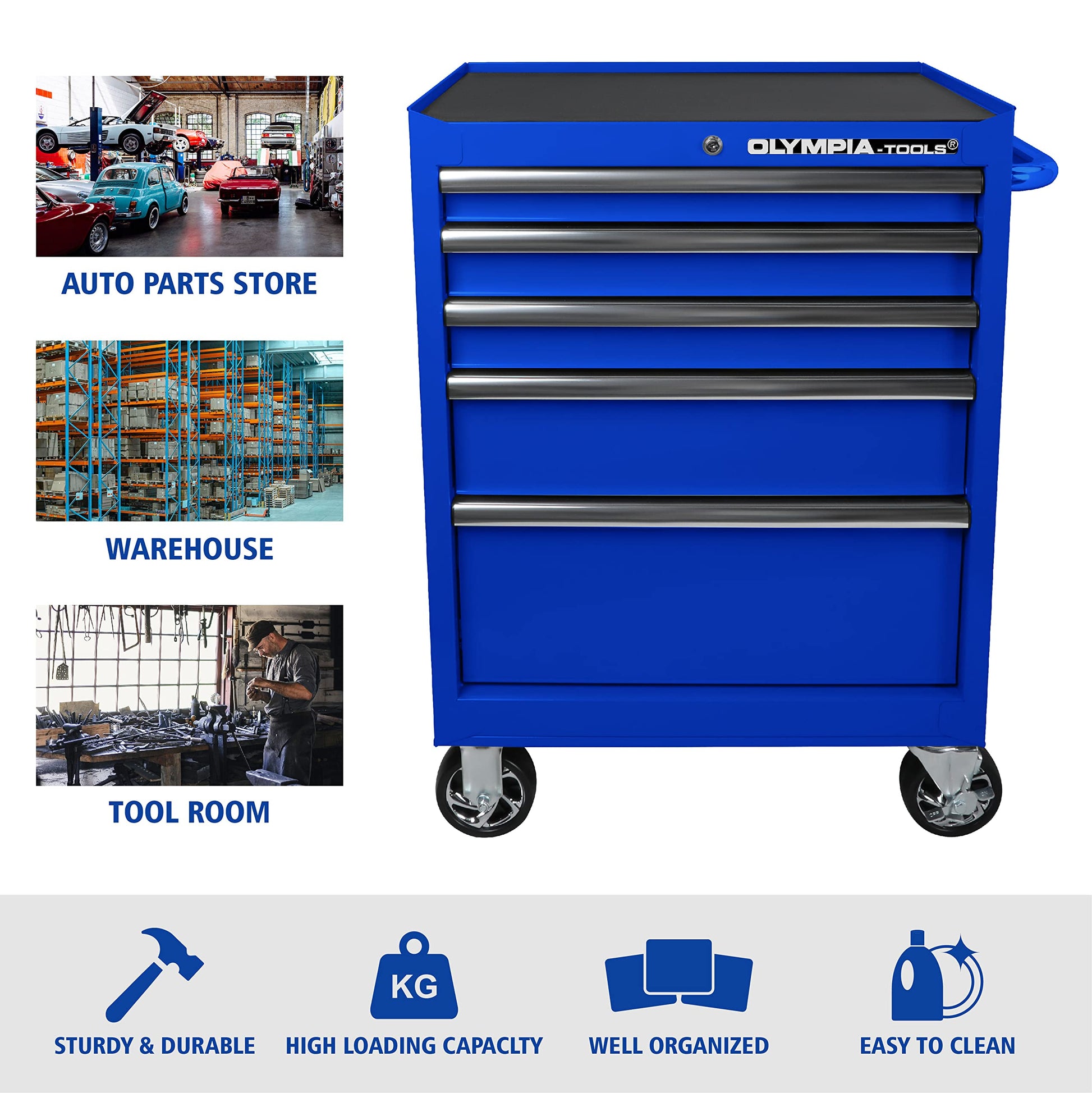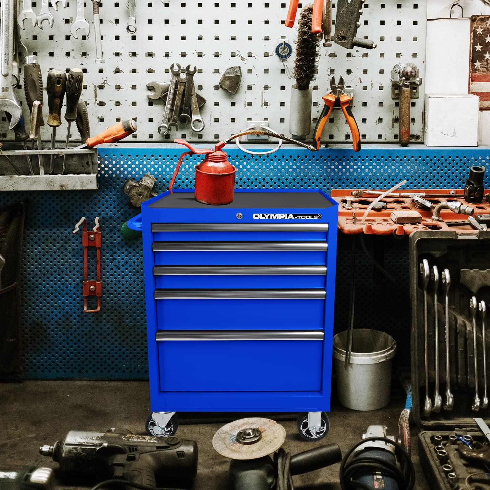 The tool box is equipped with a total of 5 drawers and a large storage space on bottom. The top storage rack provides additional space for arranging workshop accessories you often need.