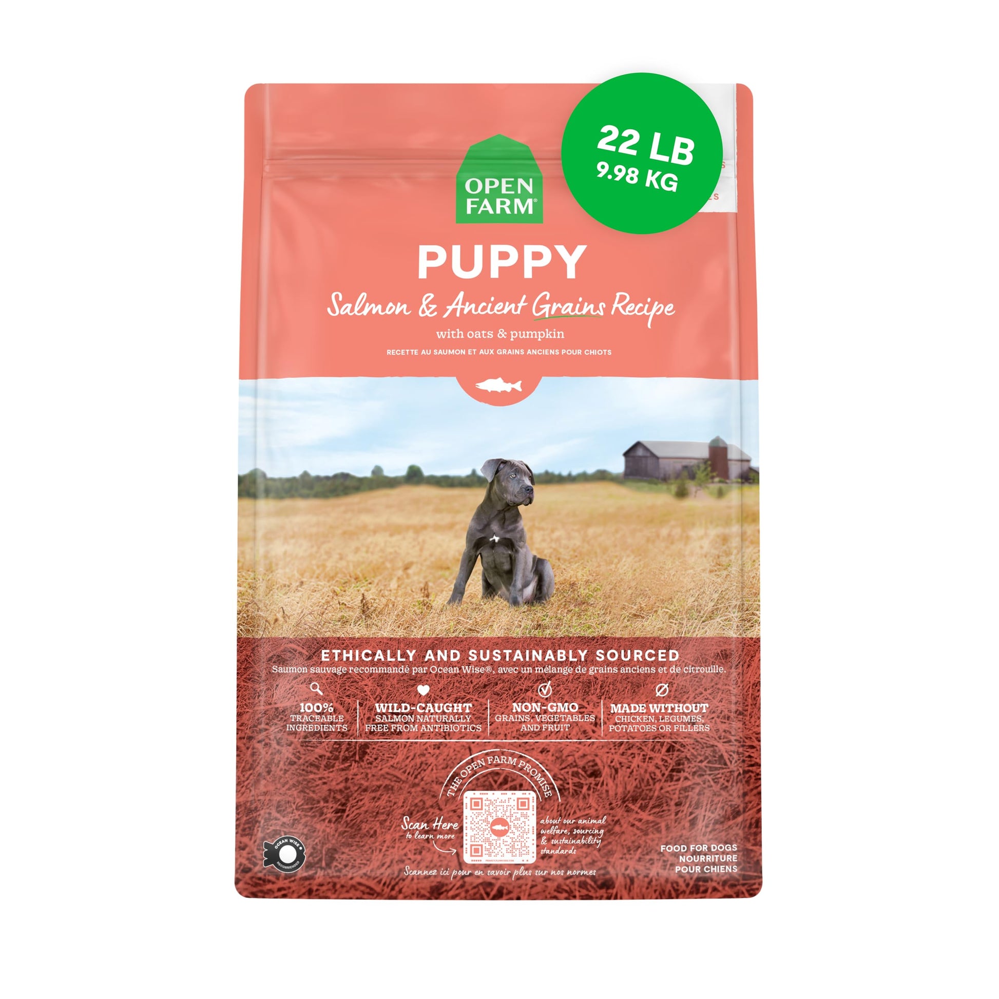 Open Farm, Ancient Grains Dry Dog Food for Puppies, Protein-Rich & Nutrient Dense, 90% Animal Protein Mixed with Non-GMO Fruits, Veggies and Superfoods, Salmon Recipe for Puppy, 22lb Bag