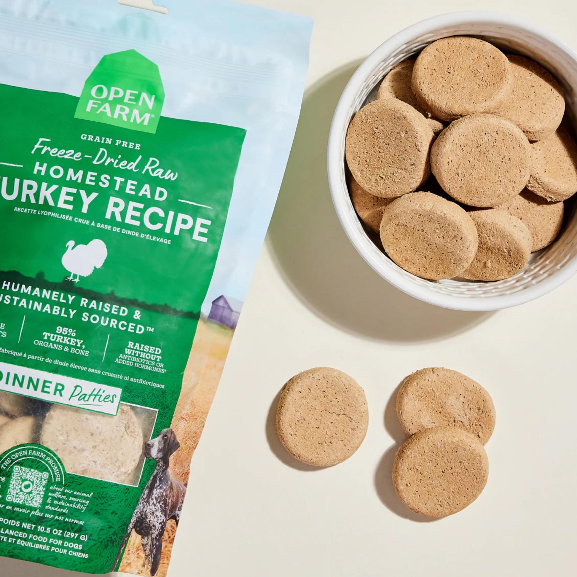 Open Farm, Freeze Dried Raw Dog Food, Patties with 95% Meat, Organs & Bone, Complete Meal or Freeze Dried Dog Food Mixer, Turkey Recipe, 17.5oz Bag