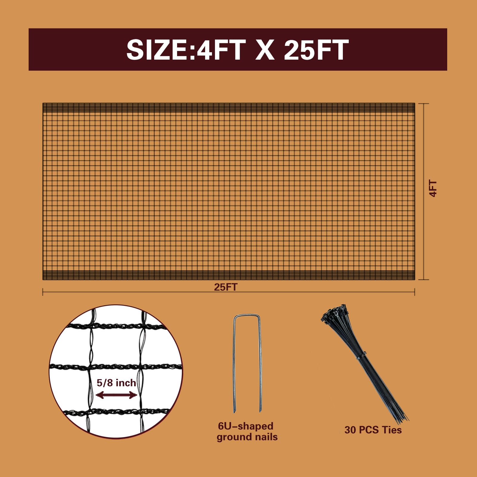UPGRADED REINFORCED AND ENCRYPTED EDGES WITH ROPES: Quick installation with tangle-free setup, securely fastening to the ground or posts for enhanced protection. The 5/8” square mesh effectively restricts animal movement, providing safety for your garden, poultry, and pets