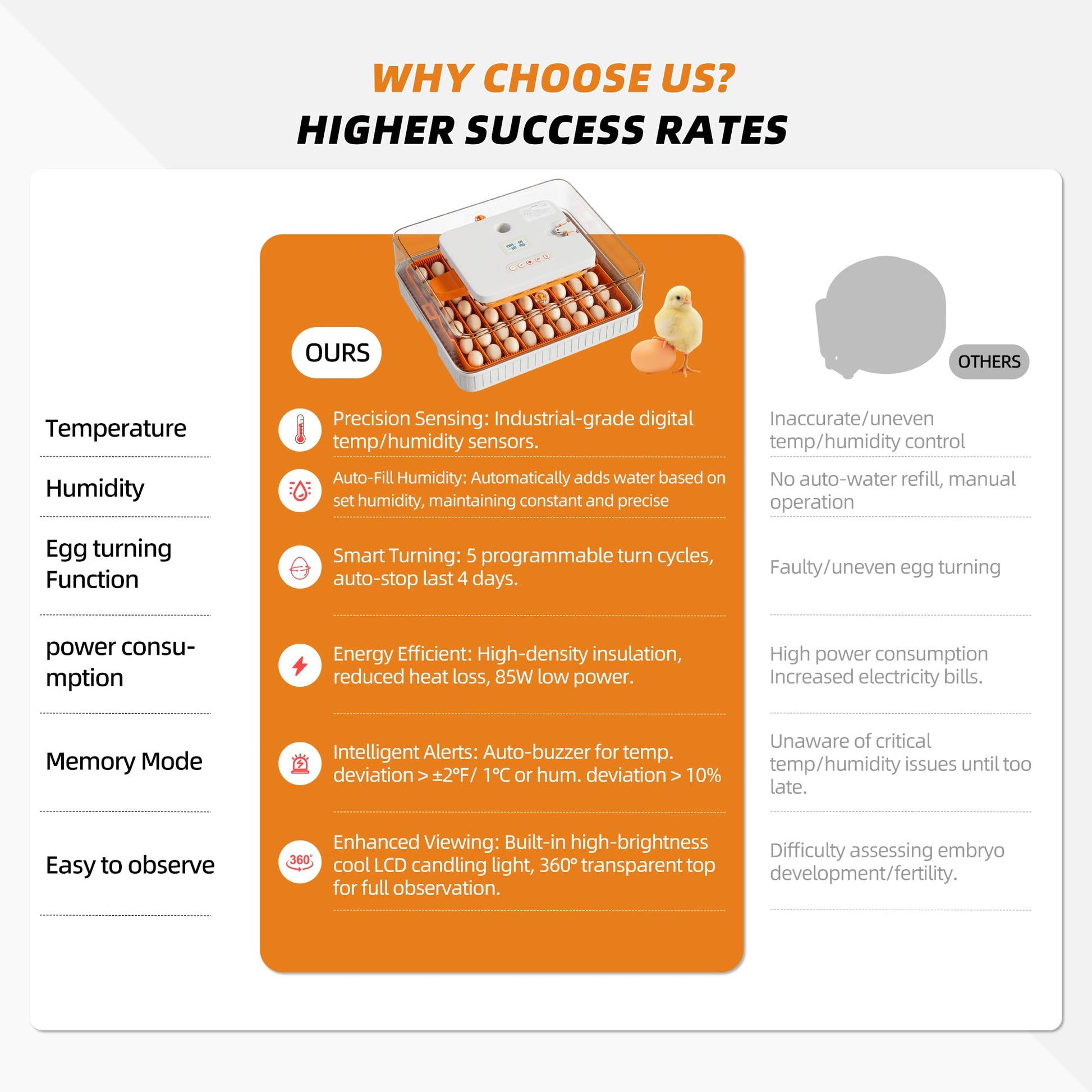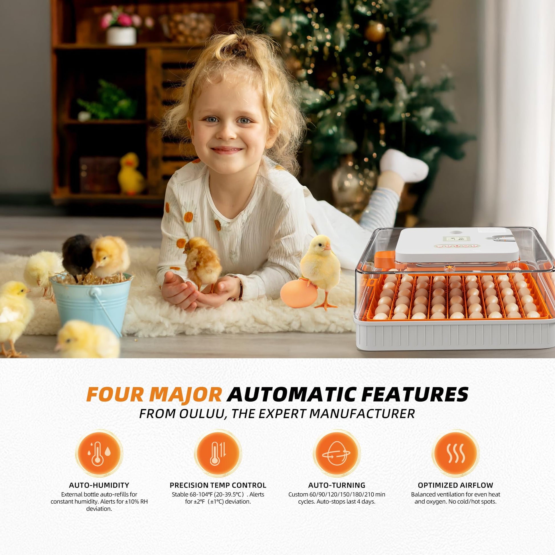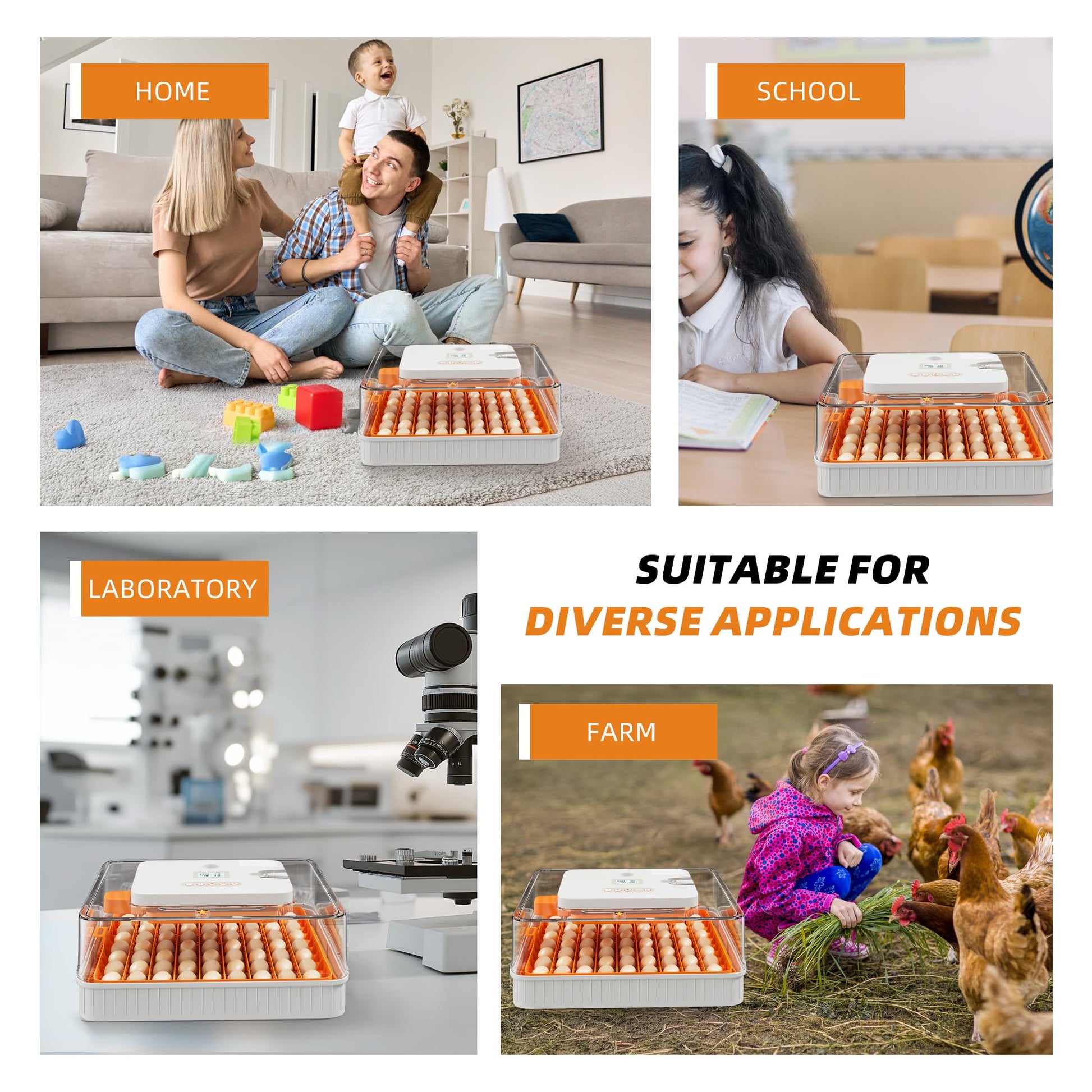 🐣 ALL-IN-ONE HATCHING & MONITORING: Ideal for all, especially beginners! Our 56-egg automatic incubator ensures easy, efficient hatching with higher success rates. Witness the amazing transformation from egg to chick with its 360° transparent viewing window, and effortlessly monitor development using the built-in cool light egg candler and real-time data display
