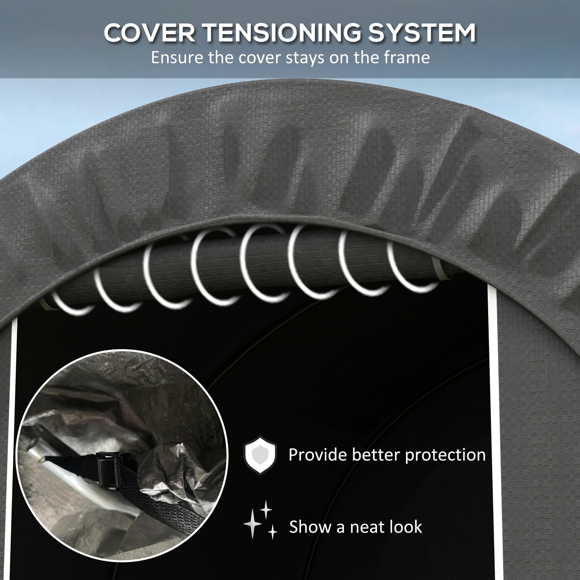 Enhanced Cover Tension: Equipped with a ratchet tension and web strap system, this portable storage shed ensures the tarp remains tightly fixed to the frame, providing a clean appearance and excellent protection against the elements.